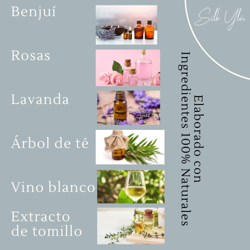 Fórmula natural elaborada con tintura de benjuí, aceite de semilla de uva, vino blanco, glicerina, agua de rosas, miel melipona, aceites esenciales de árbol de té y lavanda, y extracto de tomillo.
