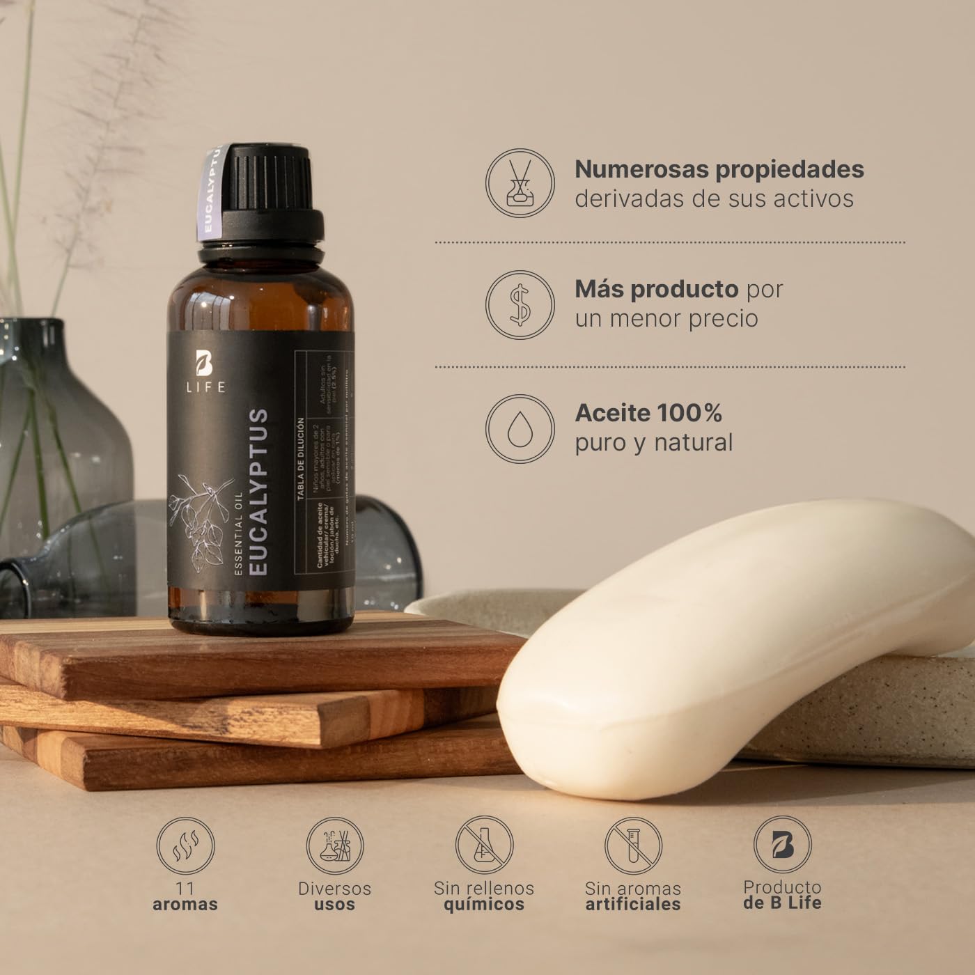 ▶ B Life Aceite Esencial con Ingredientes Puros y Naturales, Aromalogía de 50 ml. Aceite Esencial Eucalipto. B Life