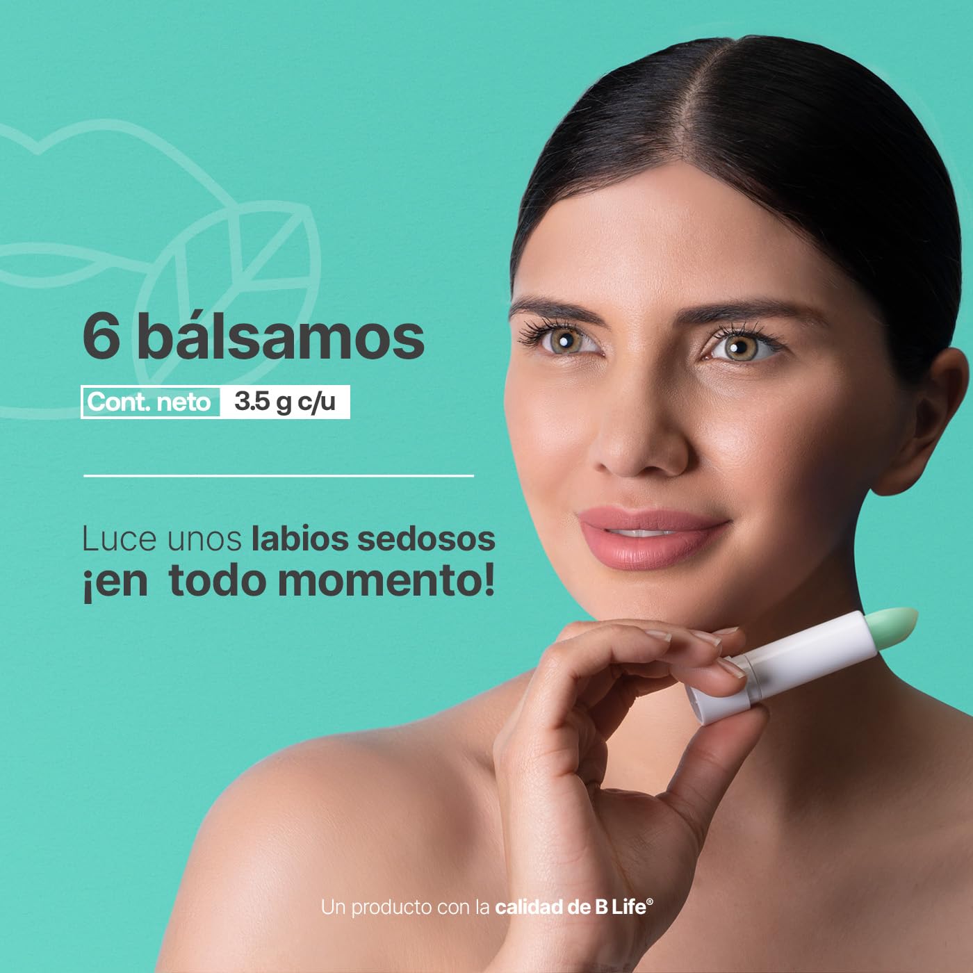 ▶ B Life | Kit De 6 Bálsamos Labiales En Barra | Aroma a Menta, Cítricos, Vainilla, Chicle, Cereza y Café | Con Vitamina E | Natural Lip Balm.
