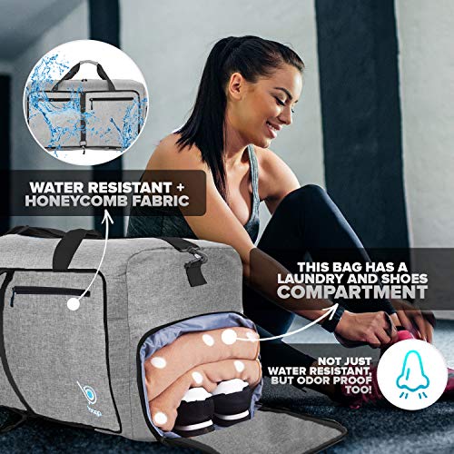 ▶ Maleta Deportiva, 80 Litros – Maleta de Viaje de Tejido Impermeable y Antidegarros – Maleta de Gym Plegable con Bolsillo para Zapatos – Bolsa de Viaje Mujer y Hombre (Gris Nieve)