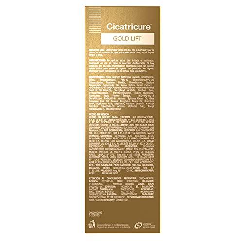 Detalles: Cicatricure desarrolló la nueva línea Antiedad Gold Lift con una exclusiva fórmula que combina el poder de los Péptidos con Oro, Calcio y Silicio impactando en la morfología de la piel, los péptidos con oro son un ingrediente muy innovador en ciencia dermocosmética para reducir el efecto causado por los años y la gravedad. Cicatricure Gold Lift Duo es una crema que actúa REDUCIENDO el tamaño de las ARRUGAS PERIOCULARES y las conocidas CÓDIGO DE BARRA en solo 6 SEMANAS. Aplica en el contorno de OJOS Y BOCA. Dermatologicamente Testeado.