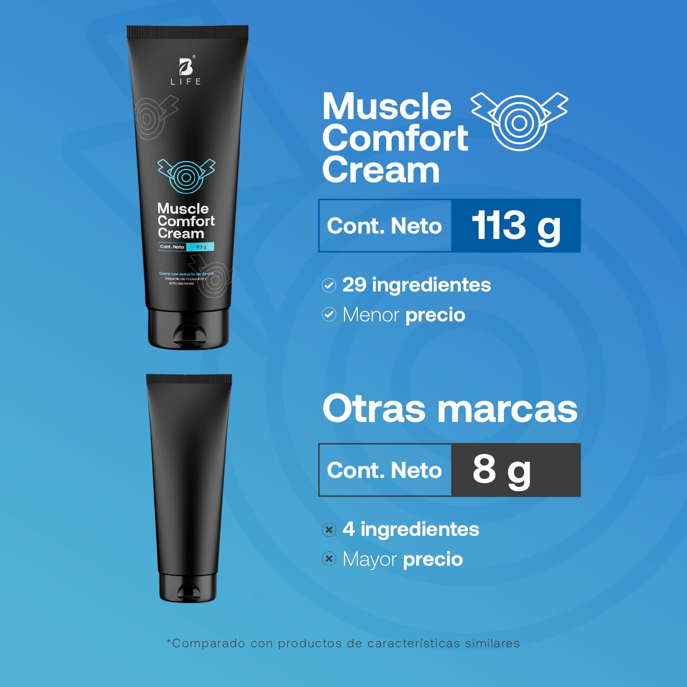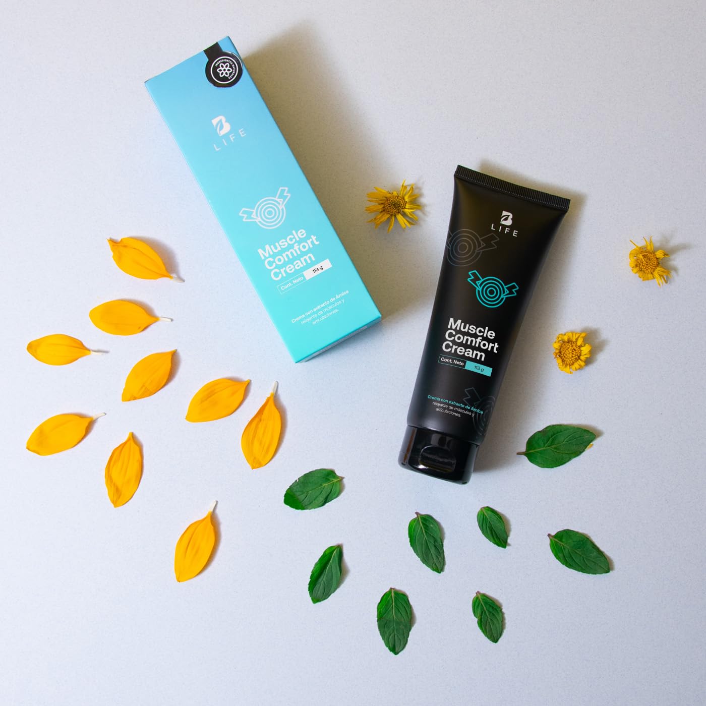 - B Life Muscle Comfort Cream, crema con Mentol y Extracto de Flor de Árnica para músculos y articulaciones. Con ingredientes naturales, apta para adultos y niños mayores de 12 años. Cuenta con 113 g.