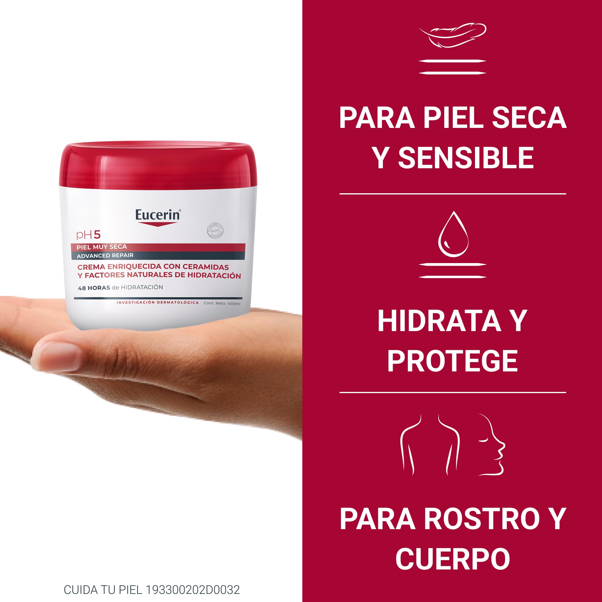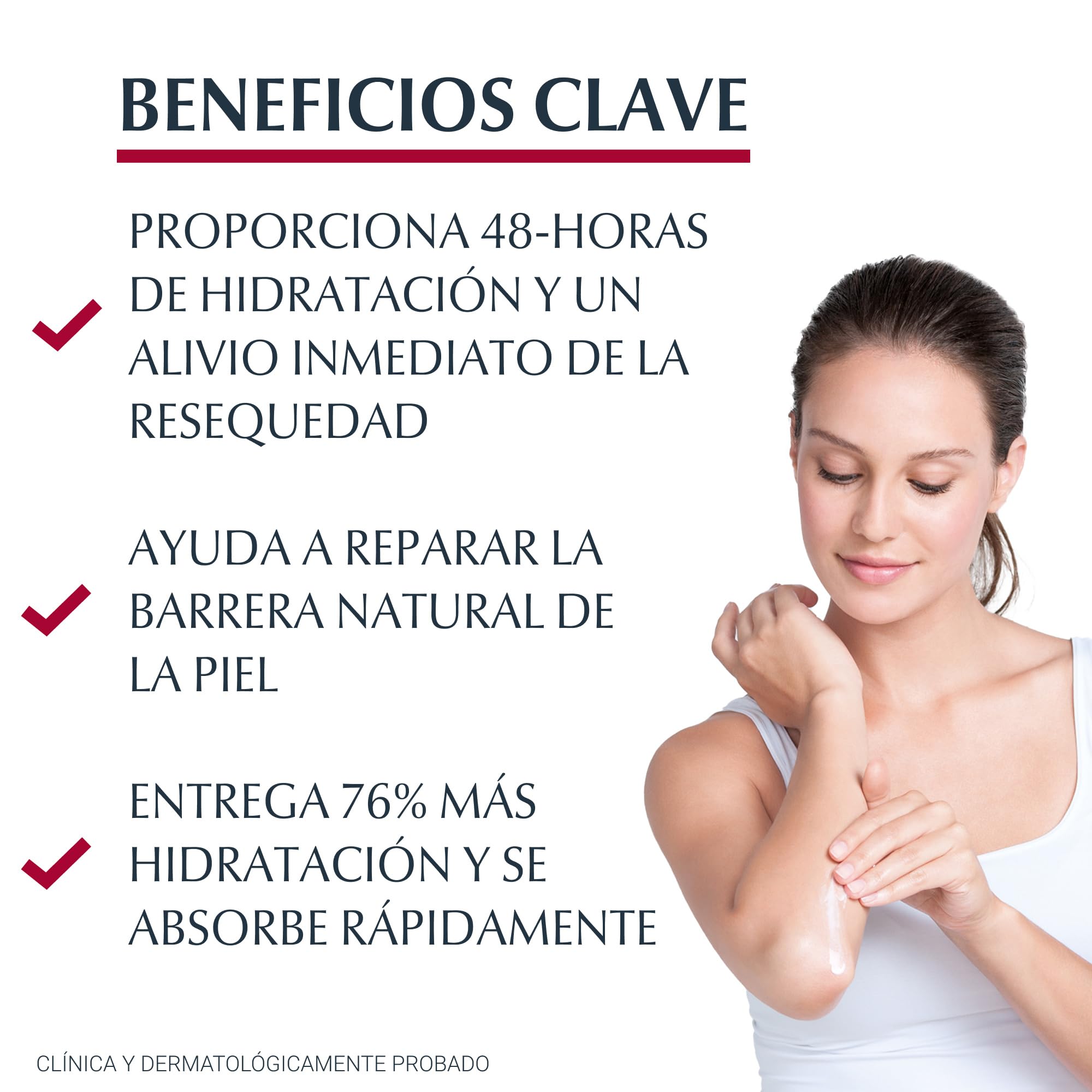 Eucerin Advanced Repair Cream es un gran avance en la reparación de la piel muy seca. Proporciona 48 horas de hidratación para una piel que se ve y se siente saludable. Esta crema corporal para pieles secas está enriquecida con Ceramidas-3 y Factores Hidratantes Naturales. Las ceramidas ayudan a fortalecer la barrera contra la humedad de la piel para retener la humedad. Factores hidratantes naturales, aminoácidos que se encuentran naturalmente en la piel, aumentan la humedad y evitan que la sequedad vuelva a ocurrir. Eucerin Advanced Repair Body Cream es una fórmula ligera y de rápida absorción. Esta crema corporal no contiene fragancias, colorantes, parabenos y es lo suficientemente suave para el uso diario. Crema corporal para piel seca entrega 48-horas de hidratación alivio inmediato de la sequedad Ayuda a reparar la barrera natural de la piel Entrega 76% más hidratación Se absorbe rápidamente