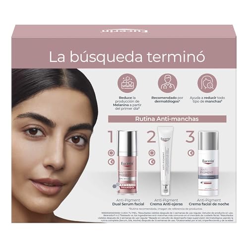 - "Eucerin Anti-Pigment Dual Serum Facial, Ayuda a reducir las manchas oscuras de la piel y previene su re-aparición. Acción dual con Thiamidol y concentrado de Ácido Hyalurónico para una piel visiblemente más uniforme y radiante. Serum de doble acción con Thiamidol y Ácido Hialurónico Reduce de forma eficaz las manchas y previene su reaparición Renueva la apariencia de la piel"