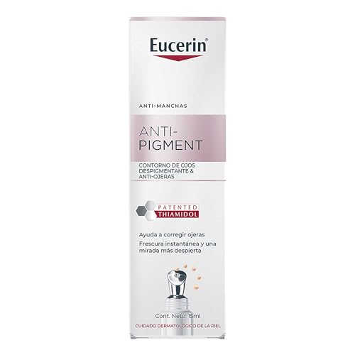 Detalles: Eucerin Anti-Pigment Crema de Ojos 15ml, Anti Manchas y Anti Ojeras, Reduce las arrugas y líneas de expresión, Hidrata intensivamente, Piel Radiante y más luminosa Fórmula con Thiamidol, Licochalcona A y Ácido Hialurónico. Crema Anti-Ojeras especialmente formulada para reducir la hiperpigmentación y mejorar la luminosidad en la delicada área del contorno de los ojos. Su fórmula ligera y fresca actúa en el origen de las ojeras, proporcionando un aspecto más despierto y fresco desde la primera aplicación. -Thiamidol: Este ingrediente patentado es altamente eficaz en reducir la producción de melanina, tratando la raíz de la hiperpigmentación y ayudando a unificar el tono de la piel para una mirada más clara y radiante. -Pigmentos Reflejantes de Luz: Los pigmentos iluminadores presentes en la fórmula ayudan a reflejar la luz en el contorno de los ojos, dando un efecto luminoso inmediato y un aspecto más descansado y fresco. -Ácido Hialurónico: Con su poderosa capacidad hidratante, el ácido hialurónico ayuda a reducir las bolsas bajo los ojos y a suavizar las líneas finas, dejando la piel más hidratada y suave. -Oligopéptidos: Estos ingredientes estimulan la producción de colágeno, mejorando la estructura dérmica de la piel y ayudando a reafirmar la zona del contorno de los ojos para un look más juvenil y firme. Tratamiento ideal para iluminar el contorno de los ojos, suavizar las líneas de expresión y reducir la hiperpigmentación. Resultados visibles después de 2 semanas de uso regular.