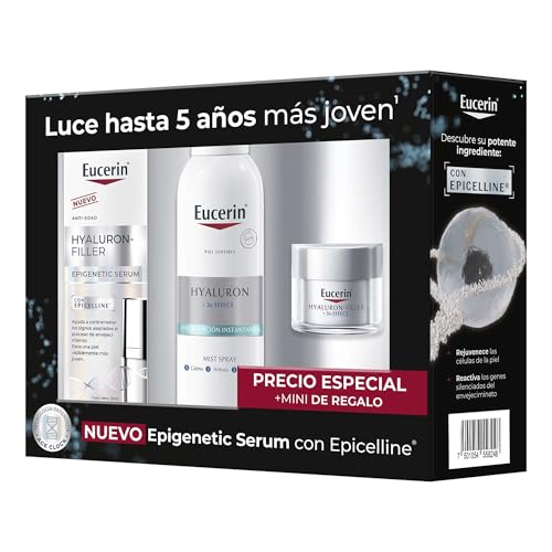 - Eucerin Hyaluron-Filler Mist Spray: Calma, Hidrata y Revitaliza, spray facial con Ácido Hialurónico y Gluco-Glicerol que favorece la hidratación instantánea y duradera con el uso regular para una piel suave y radiante. Contiene ácido hialurónico altamente concentrado con capacidad para soportar hasta 1000 veces su peso en agua. La fórmula superior única consta de 4 ingredientes hidratantes efectivos que facilitan la activación de los propios canales de distribución de humedad de la piel para transportar la humedad entre las células de la piel y el equilibrio de hidratación de la piel de soporte desde el interior