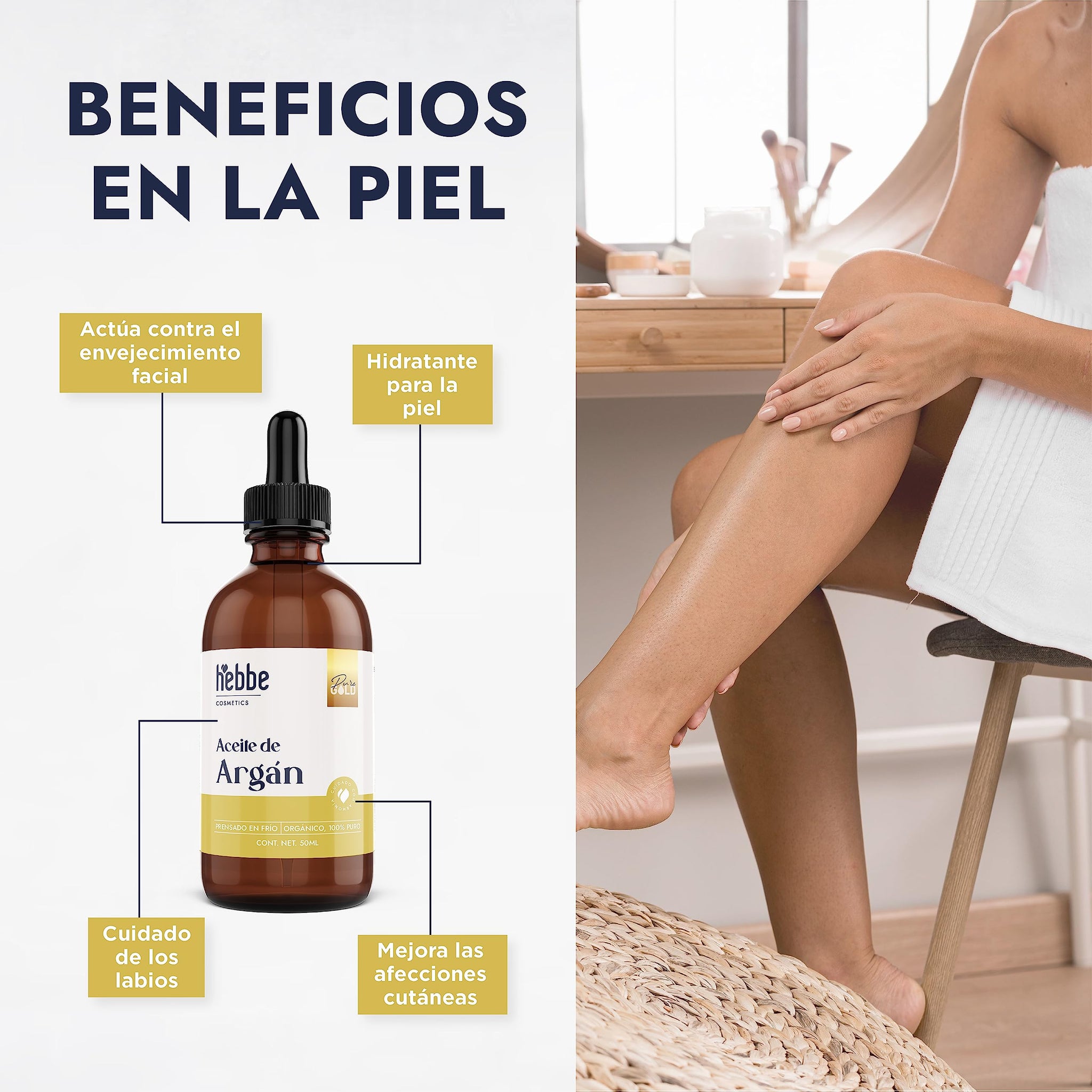 ▶ HEBBE - ACEITE DE ARGÁN PARA MEZCLA CON ACEITES ESENCIALES | Hidratante Piel | Aceite Vegetal Cosmético | Cuidado Labios y Anti-Envejecimiento | 50 ml | Natural y Libre de Químicos | Perfecto para Aromaterapia y Masajes