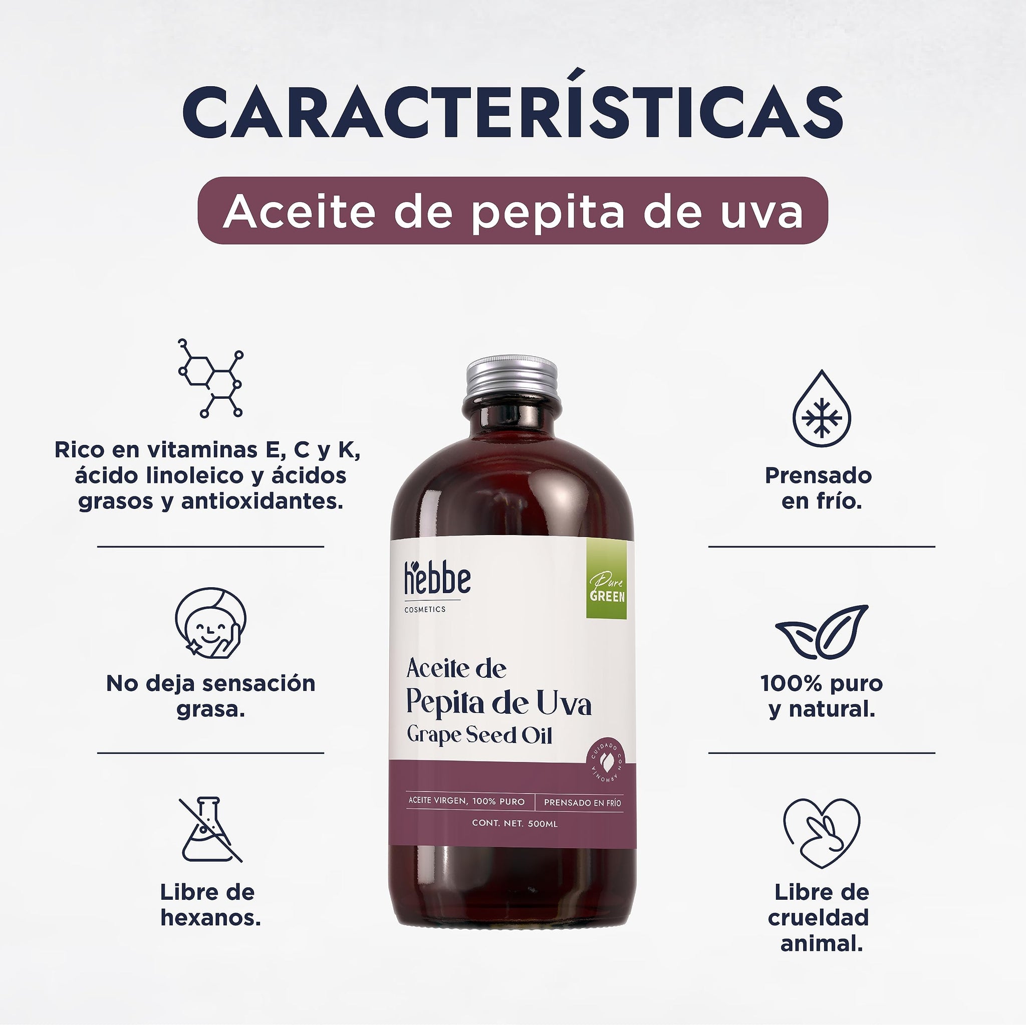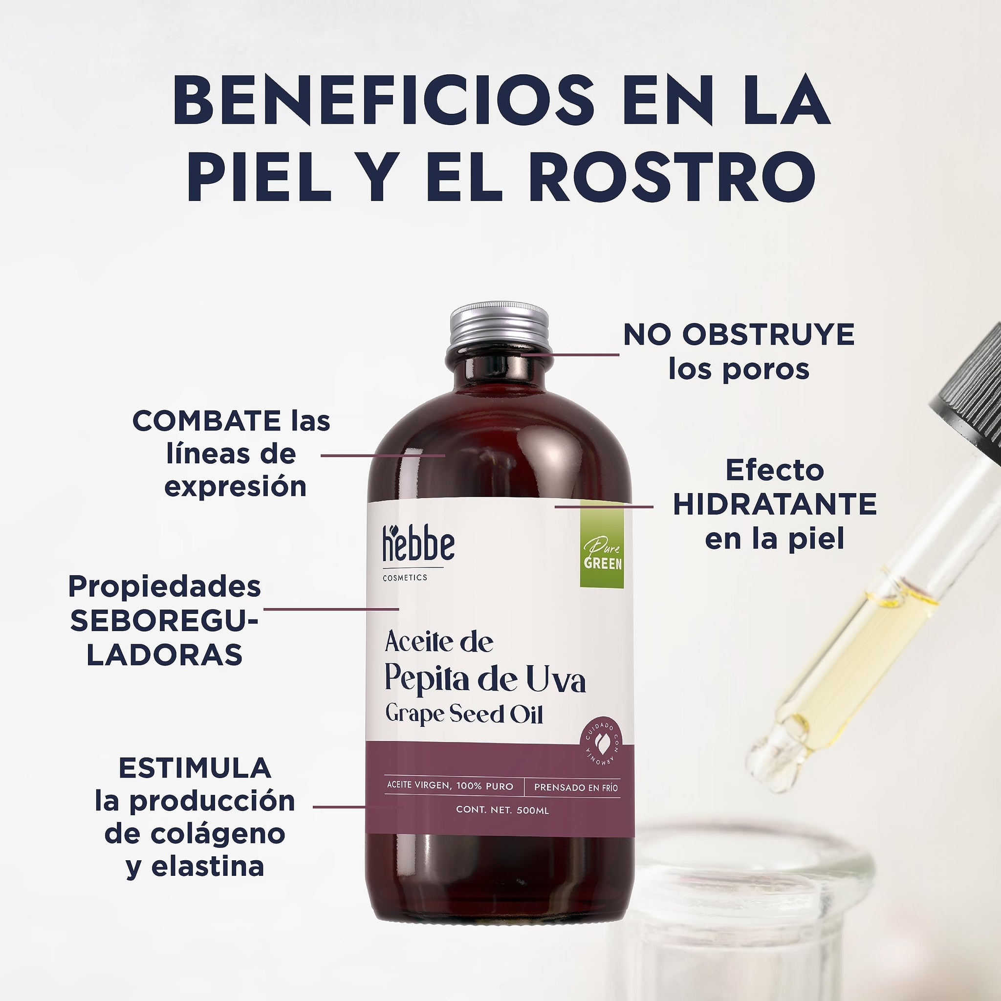 ▶ HEBBE - Aceite de Uva Pepita 500 ml | Combate Líneas de Expresión | Estimula Producción de Colágeno y Elastina | No Obstruye Poros | Hidratante de Piel | Contenido de 500 ml