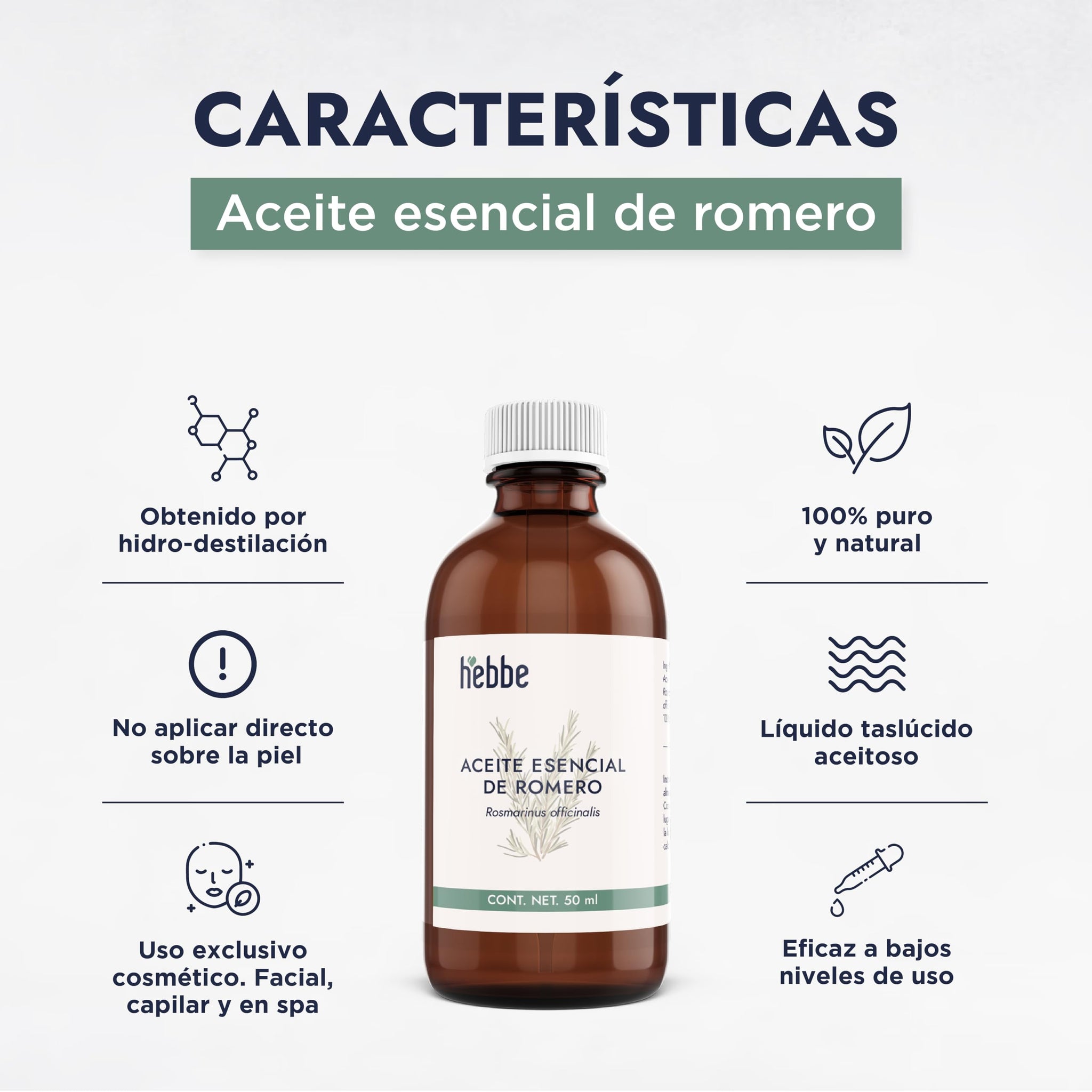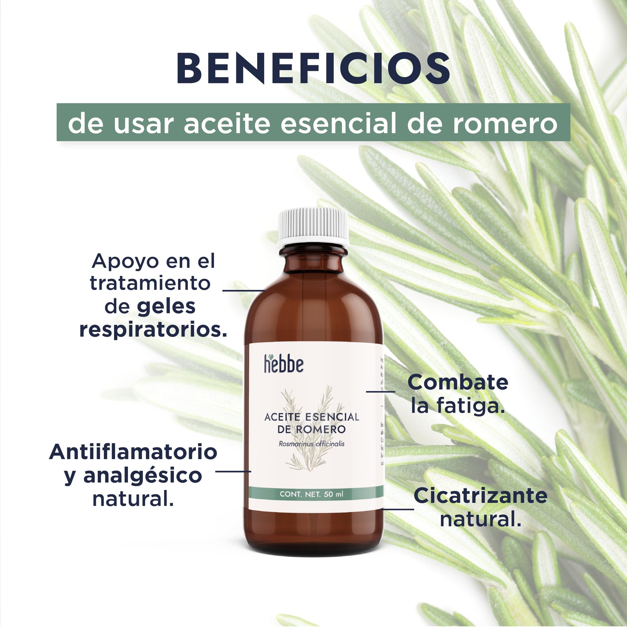 ▶ HEBBE - Aceite Esencial de Romero 50 ml | Apoyo en el Tratamiento de Problemas Respiratorios | Combate la Fatiga, es Antiinflamatorio y Analgésico Natural | Cicatrizante Natural | Contenido de 50 ml