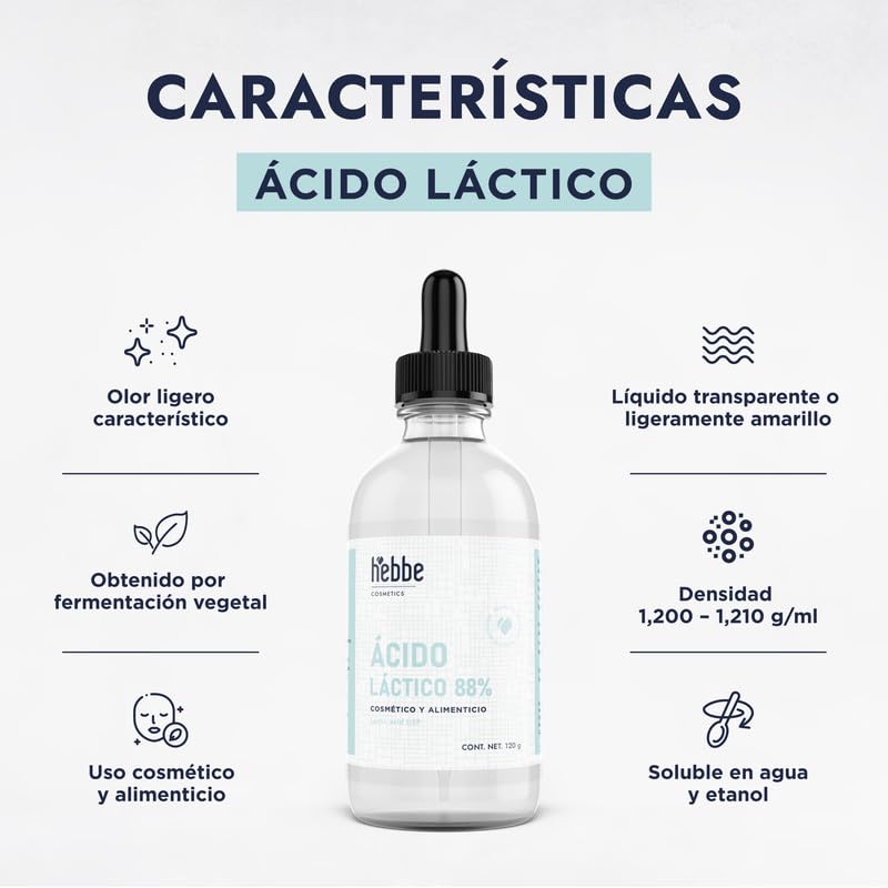 Detalles: El ácido láctico de Hebbe es un líquido incoloro utilizado ampliamente en productos cosméticos por sus propiedades exfoliantes y reguladoras del pH. Obtenido mediante fermentación de carbohidratos, este ácido es compatible con una variedad de formulaciones cosméticas, mejorando la textura y luminosidad de la piel. Ideal para peelings, cremas anti-envejecimiento y lociones hidratantes, el ácido láctico promueve la renovación celular, hidrata profundamente y ayuda a equilibrar el pH de la piel. También es eficaz en el tratamiento del acné y manchas oscuras. Almacenar en un lugar fresco y seco, protegido de la luz solar directa.