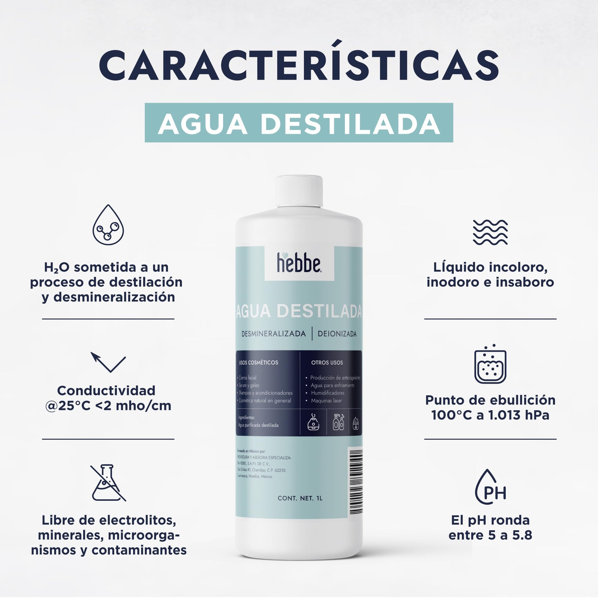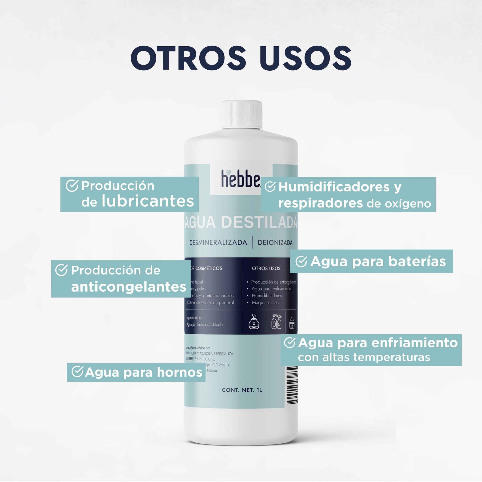 ▶ HEBBE - Agua DESTILADA para Uso COSMÉTICO | Ideal para ELABORAR Productos FACIALES como CREMAS, LOCIONES Y TÓNICOS | Uso Adicional para BATERÍAS Y PRODUCCIÓN DE LUBRICANTES | Contenido 1 LITRO