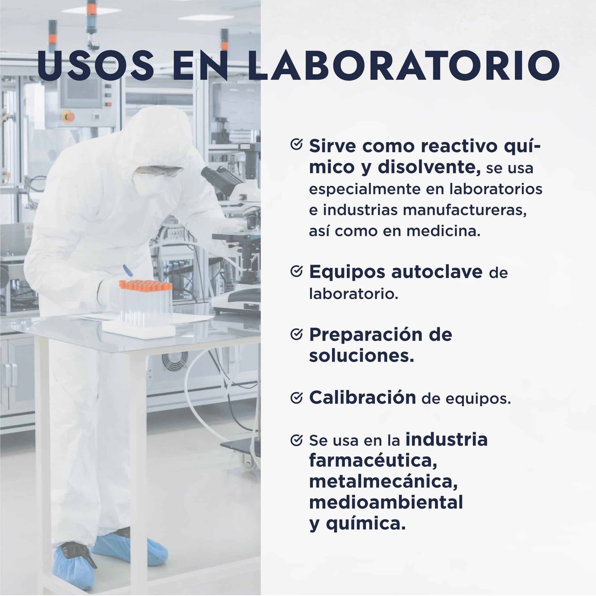 Detalles: 1 L Agua destilada y desmineralizada, de alta pureza. USOS SUGERIDOS Ideal para cosmética natural por su desmineralización ya que no altera las formulaciones. Equipos autoclave de laboratorio Humidificadores / respiradores de oxigeno Agua para baterías Agua para hornos Agua para enfriamiento con altas temperaturas Producción de lubricantes Producción de anticongelantes La industria farmacéutica, metalmecánica, medioambiental, química usa este tipo de agua Entre otros usos que puede tener."