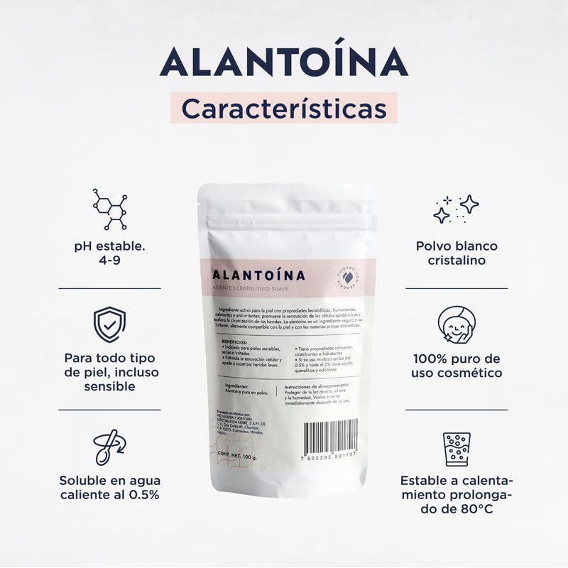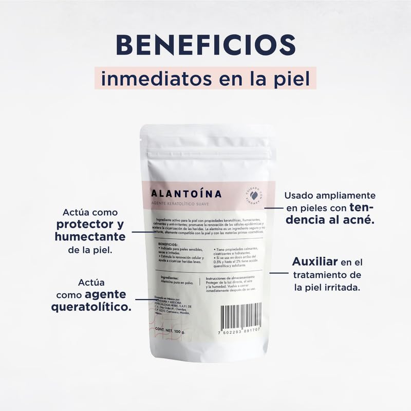 Detalles: La alantoína de Hebbe es un producto de oxidación del ácido úrico que se encuentra naturalmente en muchas plantas. Este polvo cristalino blanco es inodoro y no afecta los aromas de otros componentes. Es ideal para mejorar la cicatrización y disminuir la respuesta inflamatoria de la piel, siendo excelente para tratar la piel irritada después del sol o el afeitado, y para el control de enfermedades inflamatorias crónicas como la psoriasis. La alantoína mejora la retención de humedad de la piel, proporcionando un efecto suavizante que la hace lucir más tersa y brillante. Es ampliamente utilizada en productos para el cuidado de la piel, artículos de tocador y productos para después del sol.