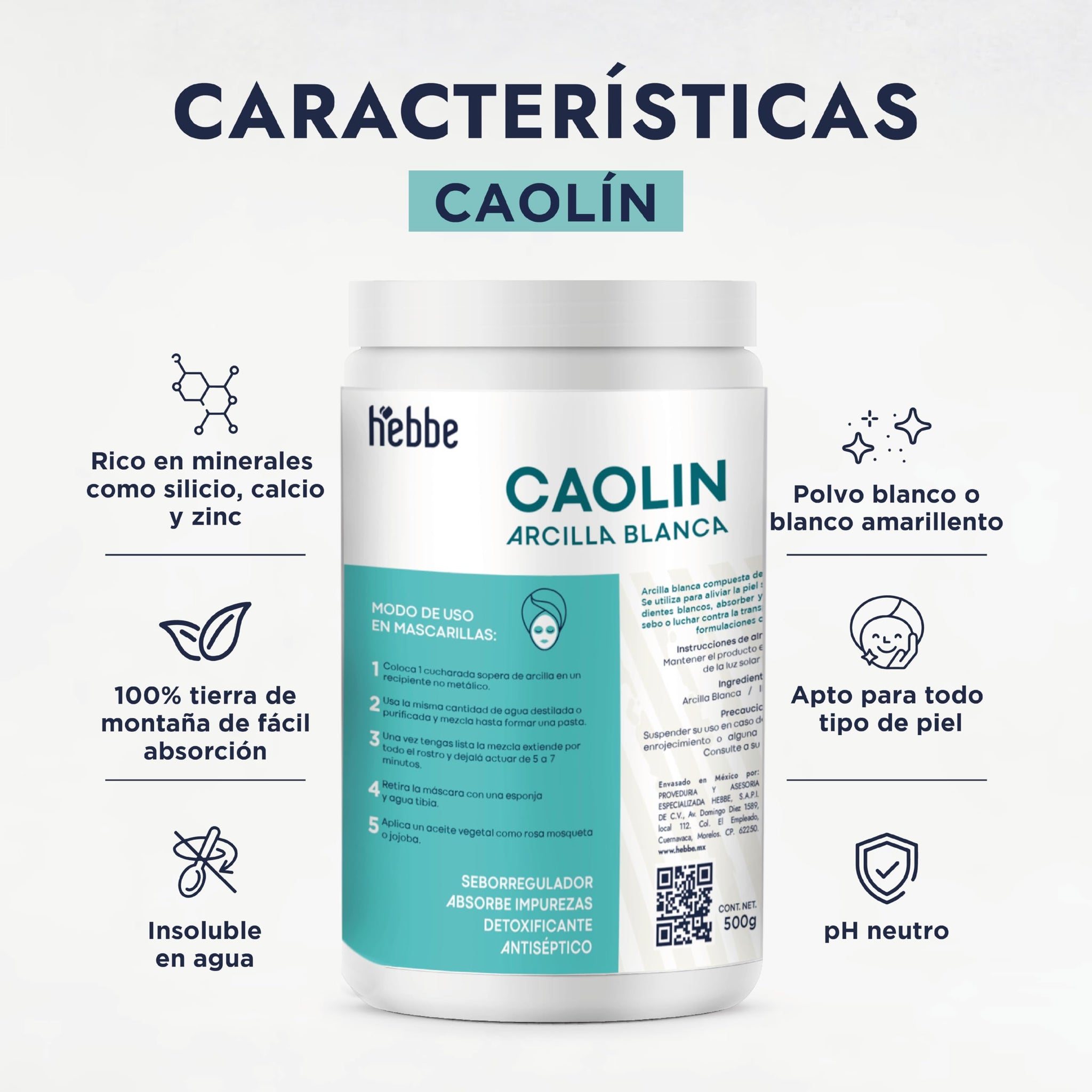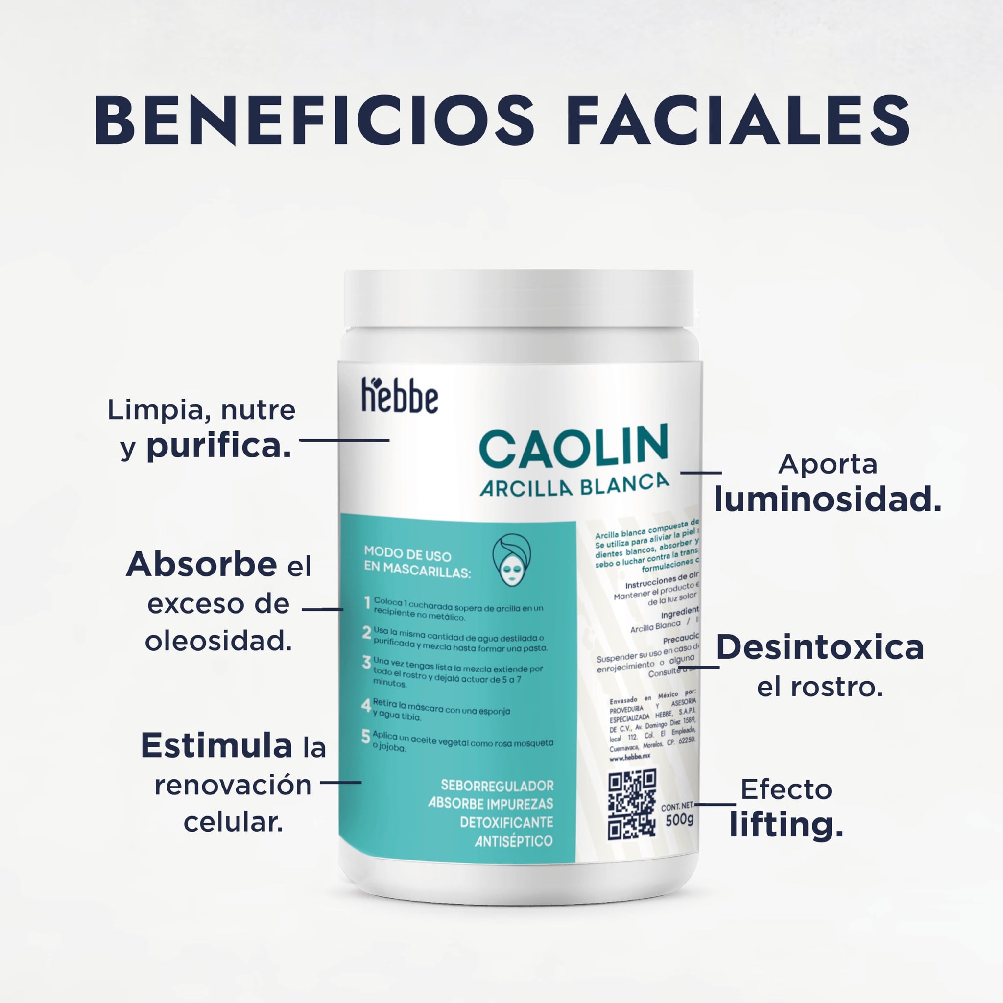 ▶ HEBBE | Arcilla Blanca Caolin | Para uso en mascarilla facial y corporal | Limpiar y Exfoliar la piel seca o grasa | 1 kg