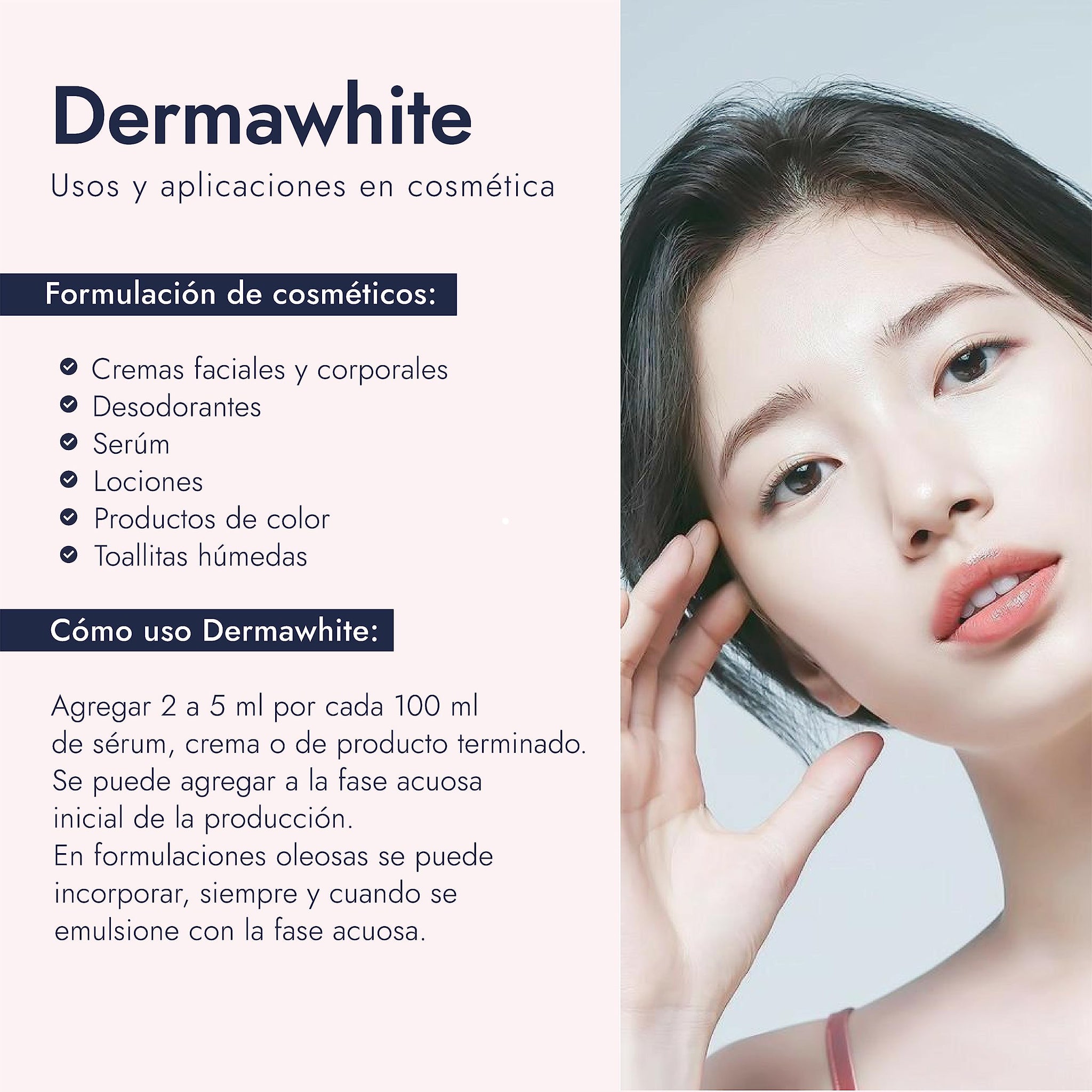 Detalles: "NOMBRE COMERCIAL: Dermawhite WF C BC10046 NOMBRE INCI: Water (and) Tartaric Acid (and) Disodium EDTA (and) Sodium Sulfite (and) Sodium Metabisulfite (and) Glycerin (and) Butylene Glycol (and) Saxifraga Sarmentosa Extract (and) Carica Papaya (Papaya) Fruit Extract (and) Psidum Guajava Fruit Extract. APARIENCIA: Líquido incoloro a amarillo pálido y olor específico. PROPIEDADES: Un activo basado en una combinación de extractos de papaya, guayaba y saxifraga. Tres flores blancas perennes que florecen con un resplandor llamativo que ayudan a aclarar e iluminar efectivamente la piel. Este complejo inhibe la síntesis de melanina en un 90%. Efectivo, agradable a la piel y con un precio competitivo. BENEFICIOS: Inhibe la síntesis de melanina. Beneficios aclarantes y luminiscentes significativos. Tres veces más efectivo que el ácido kójico. APLICACIONES: Cremas faciales y corporales Desodorantes Serum Lociones Productos de color Toallitas húmedas SOLUBILIDAD EN AGUA: Miscible CONDICIONES DE ALMACENAMIENTO: Mantener el producto en envases cerrados y protegidos de la luz y humedad. Almacene a una temperatura de 10 a 30 °C."