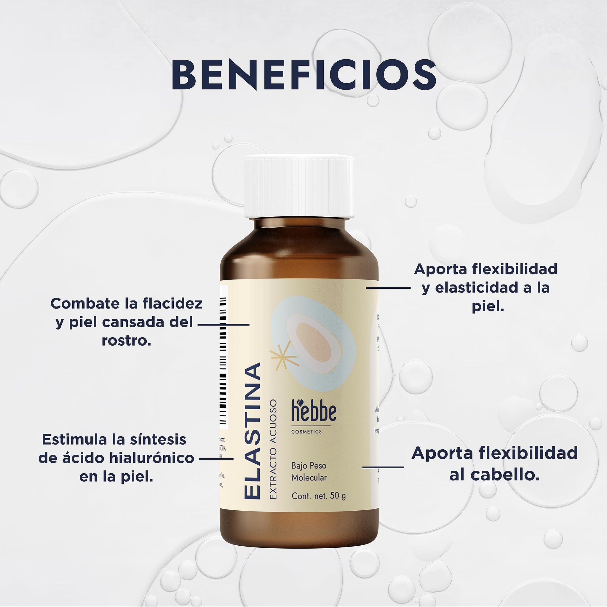 - HEBBE - Elastina Acuosa 50g | Reafirma y Tonifica Piel | Combate Signos de Fatiga | Estimula Producción Natural | Aporta Elasticidad y Resiliencia | Fórmula Concentrada.