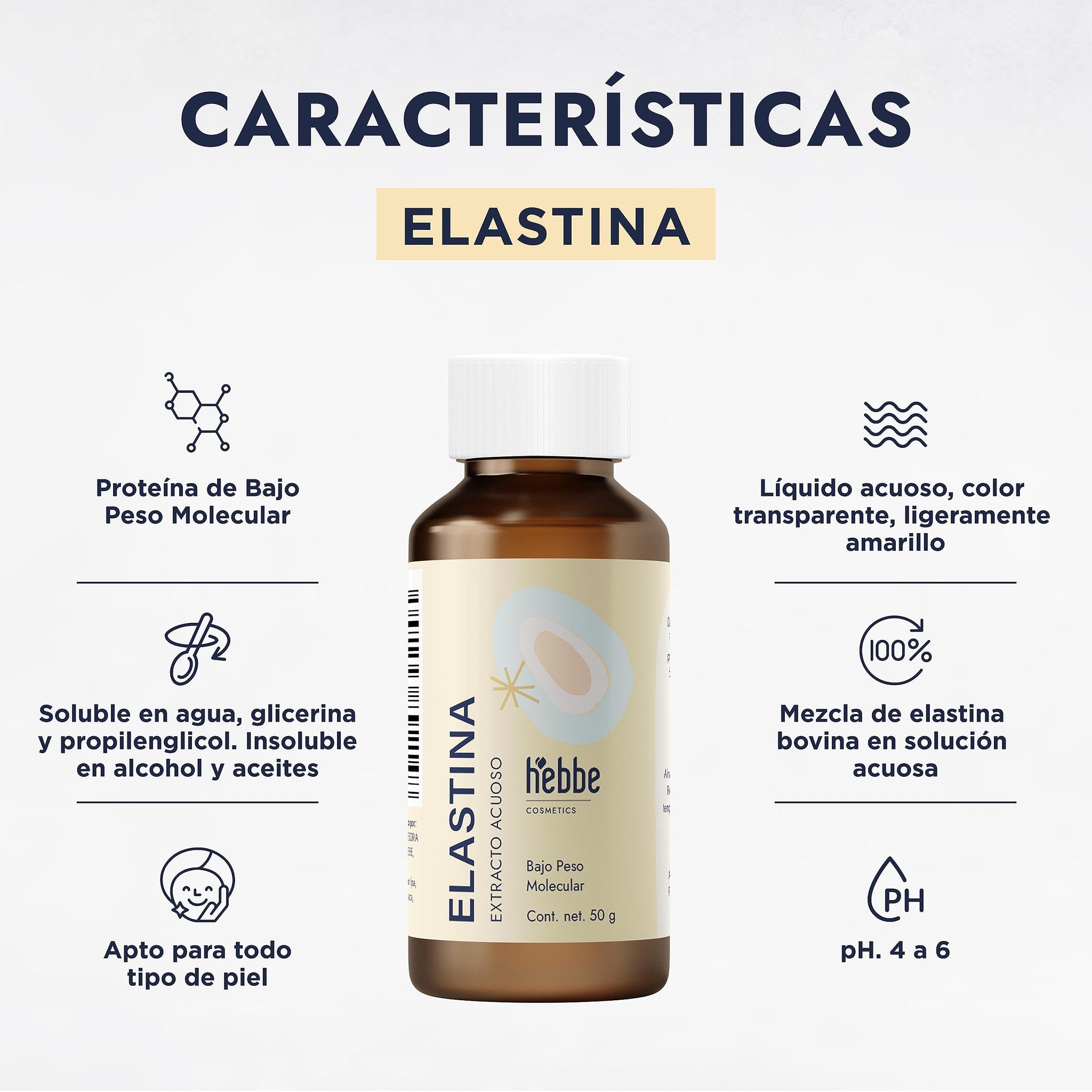 Detalles: HEBBE - Elastina Acuosa 50g | Reafirma y Tonifica Piel | Combate Signos de Fatiga | Estimula Producción Natural | Aporta Elasticidad y Resiliencia | Fórmula Concentrada.