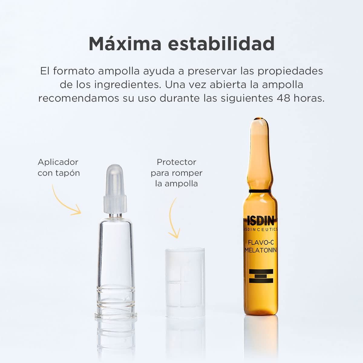 Detalles: Isdinceutics Flavo-C Melatonin. Serum reparador de noche, Solución facial en ampollas que trabaja mientras duermes estimulando las defensas antioxidantes de la piel.