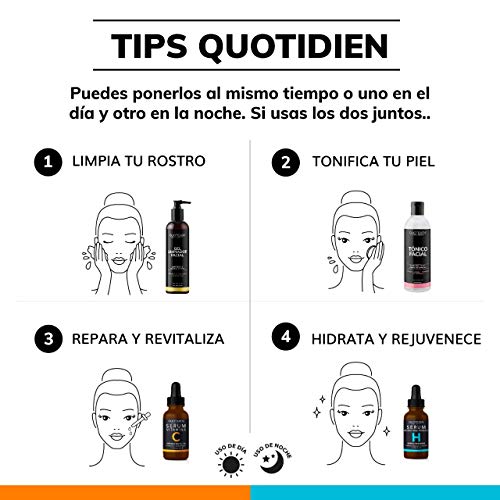 - COMBINACION PERFECTA SERUM C+ SERUM H: El Serum Vitamina C y el Serum Ácido Hialurónico son la combinación ideal para una rutina completa de cuidado facial. Es todo lo que tu piel necesita para verse radiante. El Serum C trabaja en la luminosidad y textura de la piel y el Serum H en la hidratación y firmeza. Puedes usarlo juntos o uno en el día y otro en la noche. Si los utilizas juntos, ¡el Serum C siempre va primero! Aplícalos siempre sobre la piel limpia.
