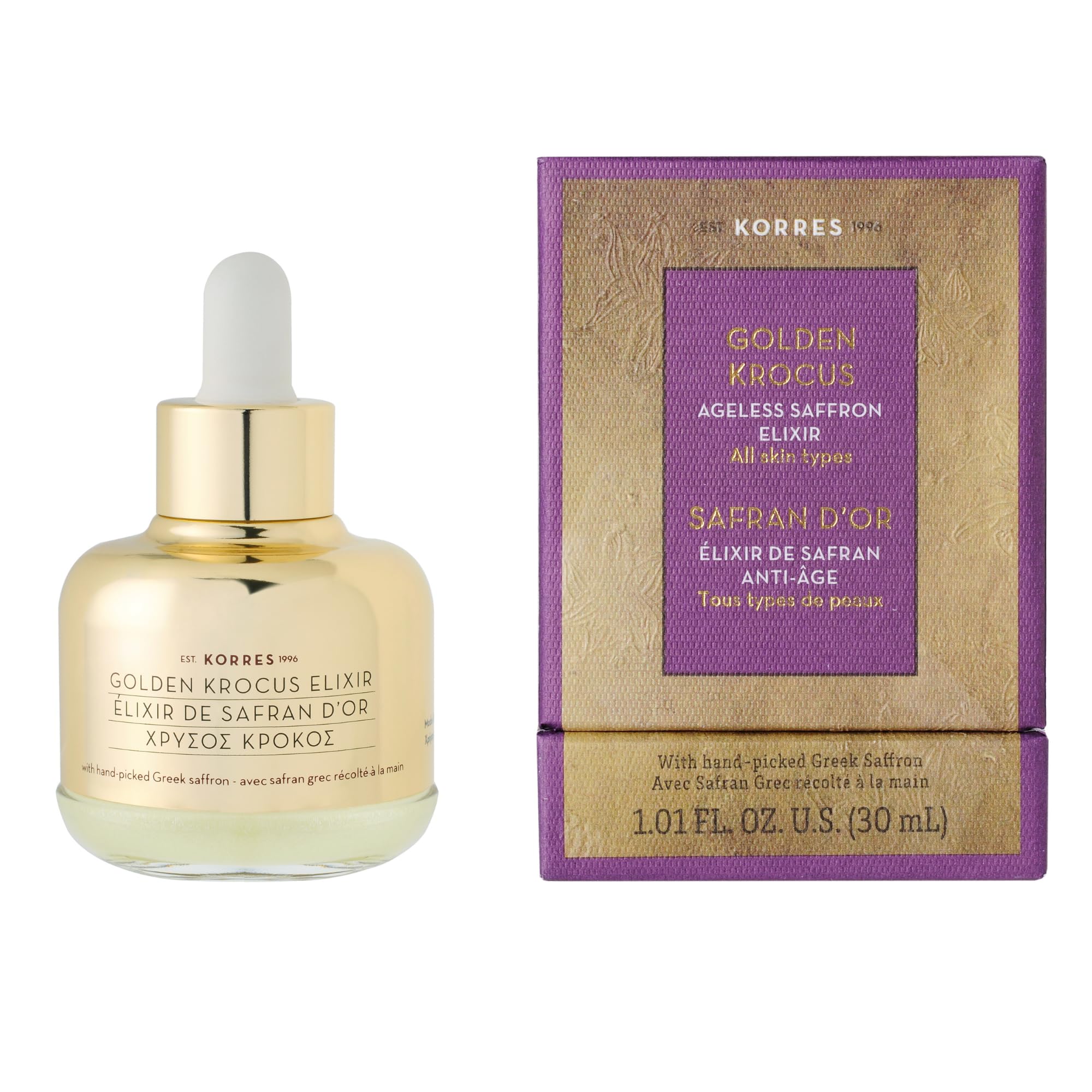 Detalles: In the Greek town of Kozani, lush Krocus flowers bloom only once per year and produce the highest quality organic saffron in the world – a potent spice more precious than gold. KORRES extracts the full power of this hand-picked, one-day fresh saffron at its maximum antioxidant levels and combines it with beta-glucans, peptides and amino acids to create this ageless elixir that strengthens skin’s resistance to daily damage. A complex of amino acids, polysaccharides, and copper helps to visibly firm and lift skin while reducing the appearance of wrinkles, and low molecular weight hyaluronic acid easily smooths, plumps, and brightens skin. Much more than your typical serum, this universal and powerful booster repairs all signs of aging for all skin types and concerns. Experience a few golden drops every day for ageless, youthful, glowing skin.