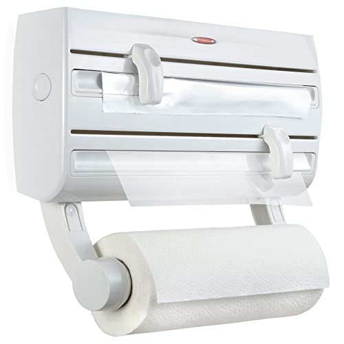 - Empotrado a pared ahorrador de espacio: soporte empotrado en pared para toalla de papel con dispensadores integrados de envoltura de plástico y aluminio con espacio en la parte superior para especias