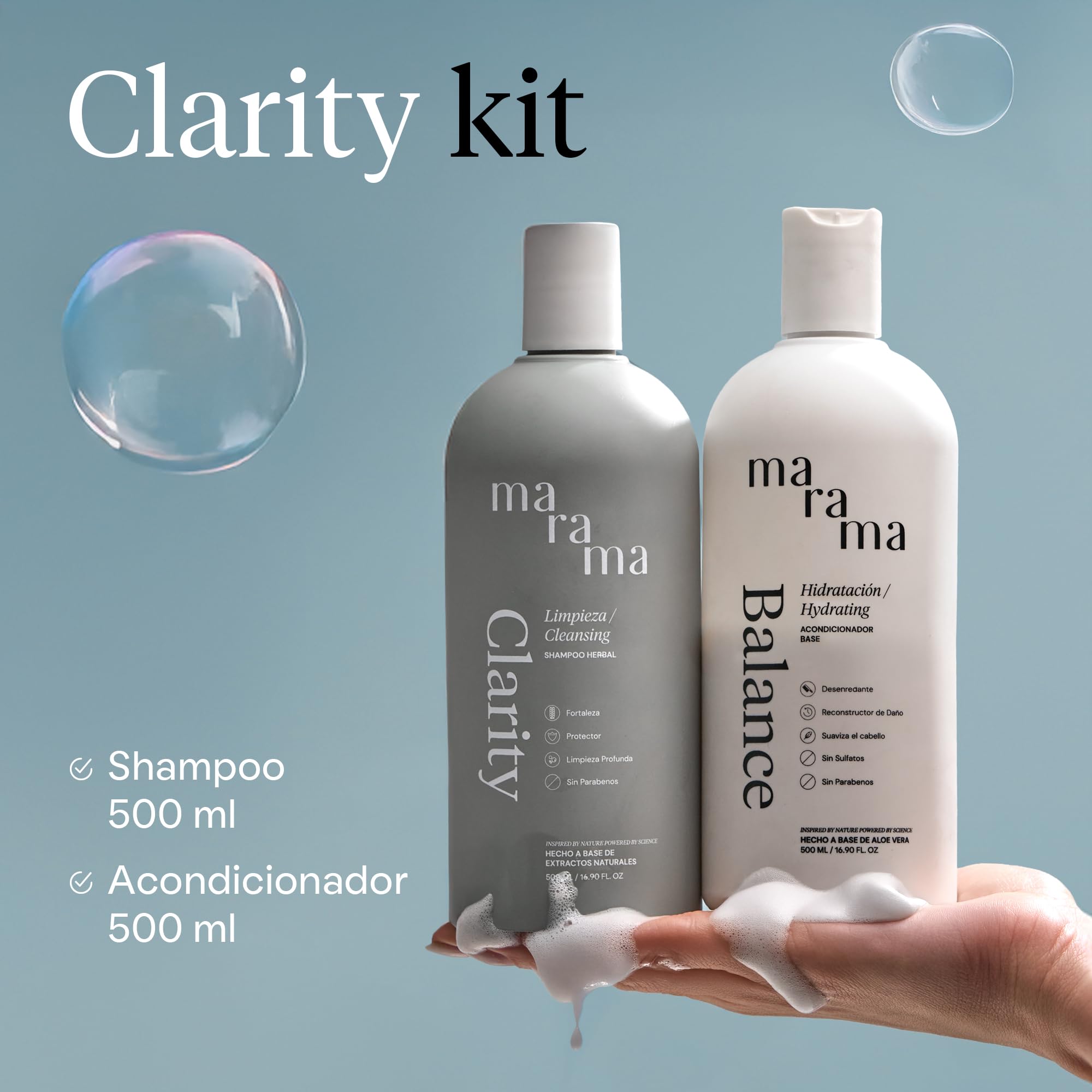 - ¿QUÉ INCLUYE? | Nuestro Clarity Kit contiene 1 Herbal Shampoo de 500ml, formulado para limpiar suavemente sin causar daños ni dejar residuos indeseados. También, incluye el Aloe Acondicionador de 500ml que nutre y suaviza tu cabello, dejándolo más manejable y libre de frizz.