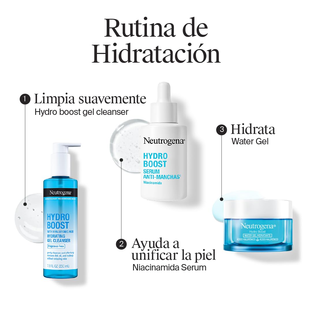 Detalles: Nuevo Neutrogena® Serum Anti-Manchas¹ Hydro Boost con Niacinamida y Ácido Hialurónico 30ml. Ingredientes aprobados por dermatólogos. Mantén una piel suave y renovada con nuestro serum con 10 % de niacinamida, ácido hialurónico y neoglucosamina. Este poderoso serum hidratante de acción múltiple exfolia para refinar el aspecto de los poros y mejorar el aspecto de la piel con un tono más uniforme. Además, ayuda a fortalecer la barrera de la piel mientras mejora visiblemente la textura de la piel opaca e irregular. ¹Marcas causadas por la exposición al sol.