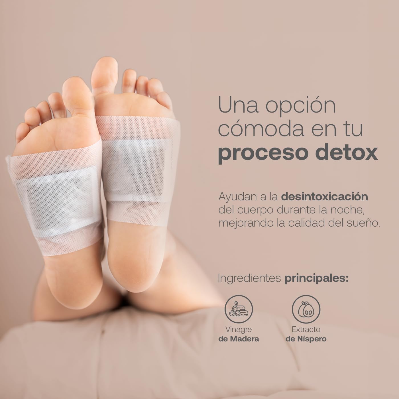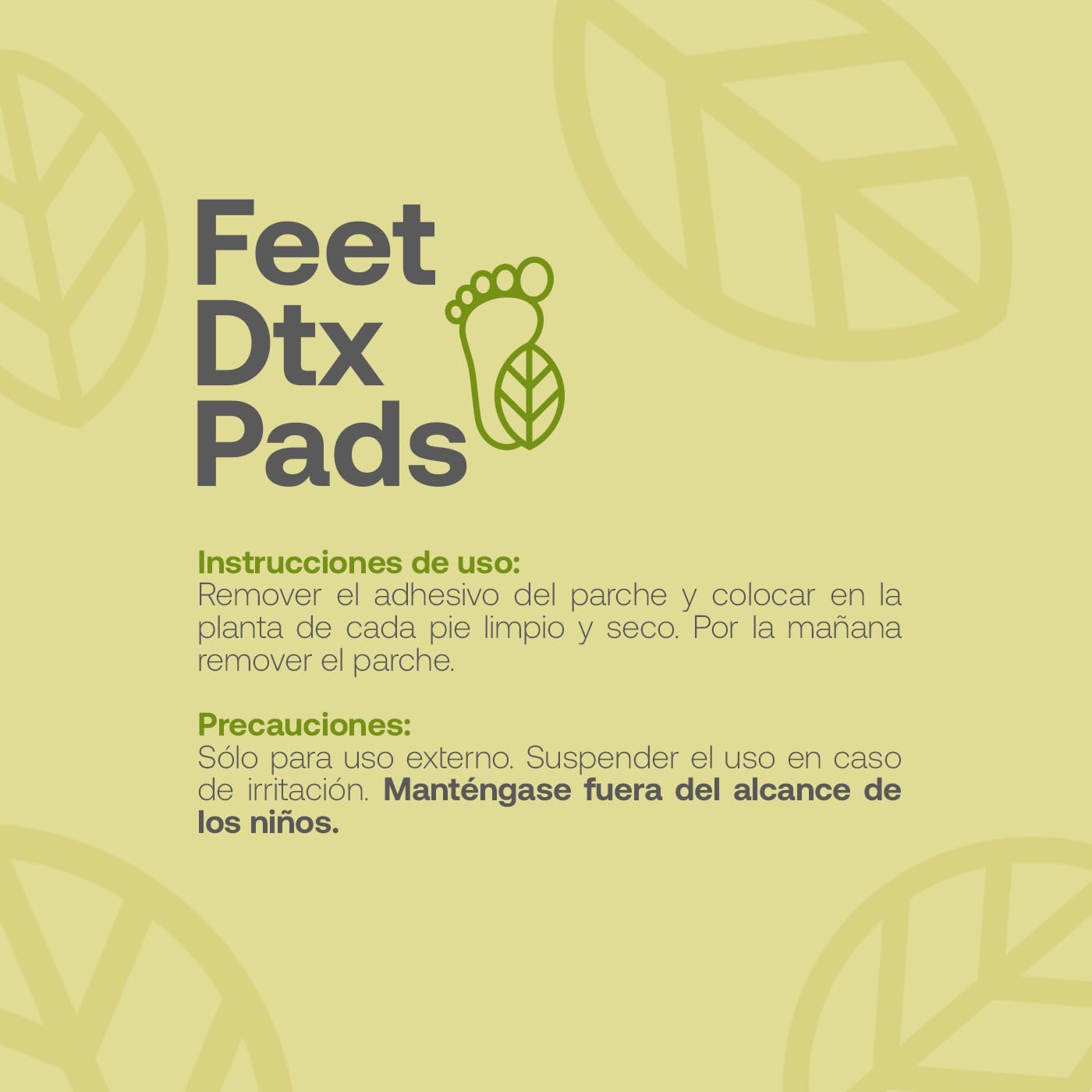 - 1. Remueve el adhesivo del parche 2. Colocar sobre la planta del pie con la piel seca. 3. Por la mañana remueve el parche.