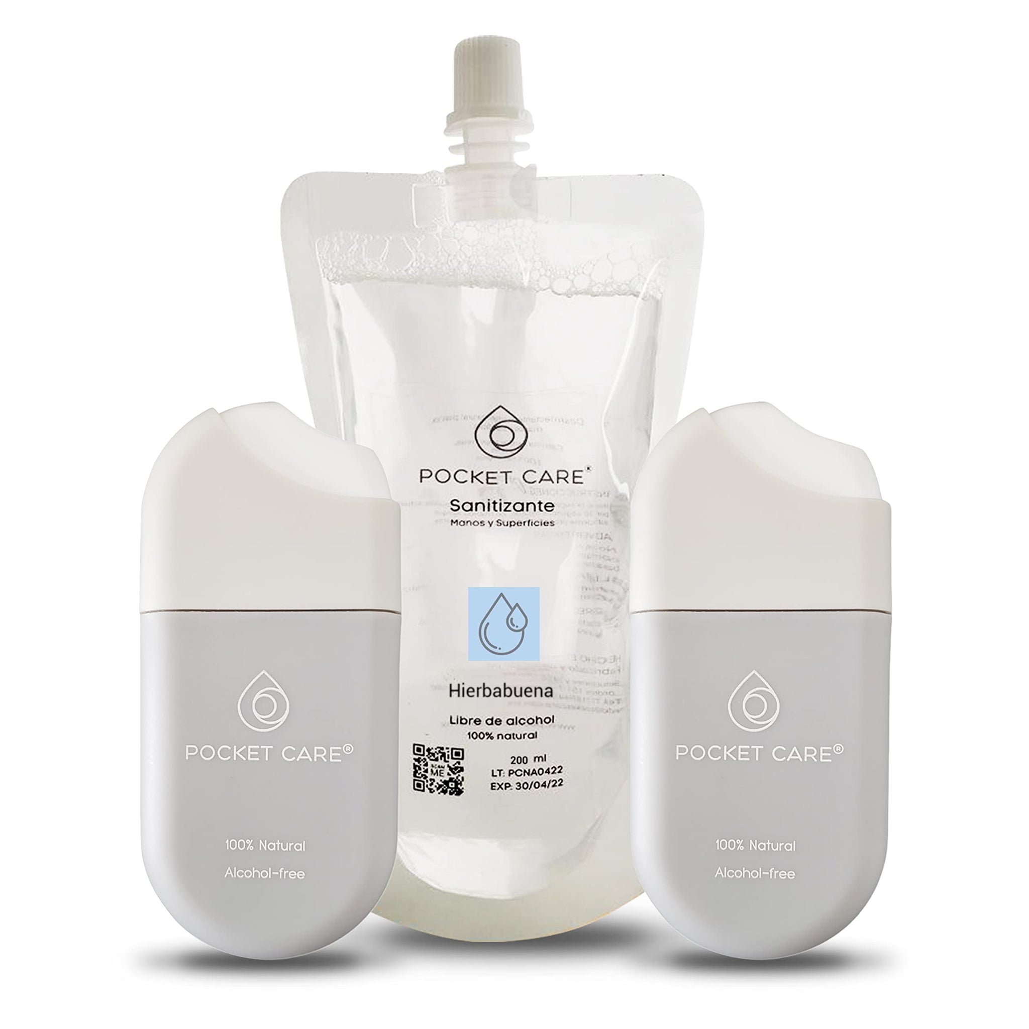 ▶ POCKET CARE | KIT Desinfectante Spray - Sin Alcohol | 2 Spray 15ml - SUAVE HIERBABUENA | Antibacterial Spray de Bolsillo Orgánico + REFILL 200ml | Sanitizante para Manos | Hand Sanitizer