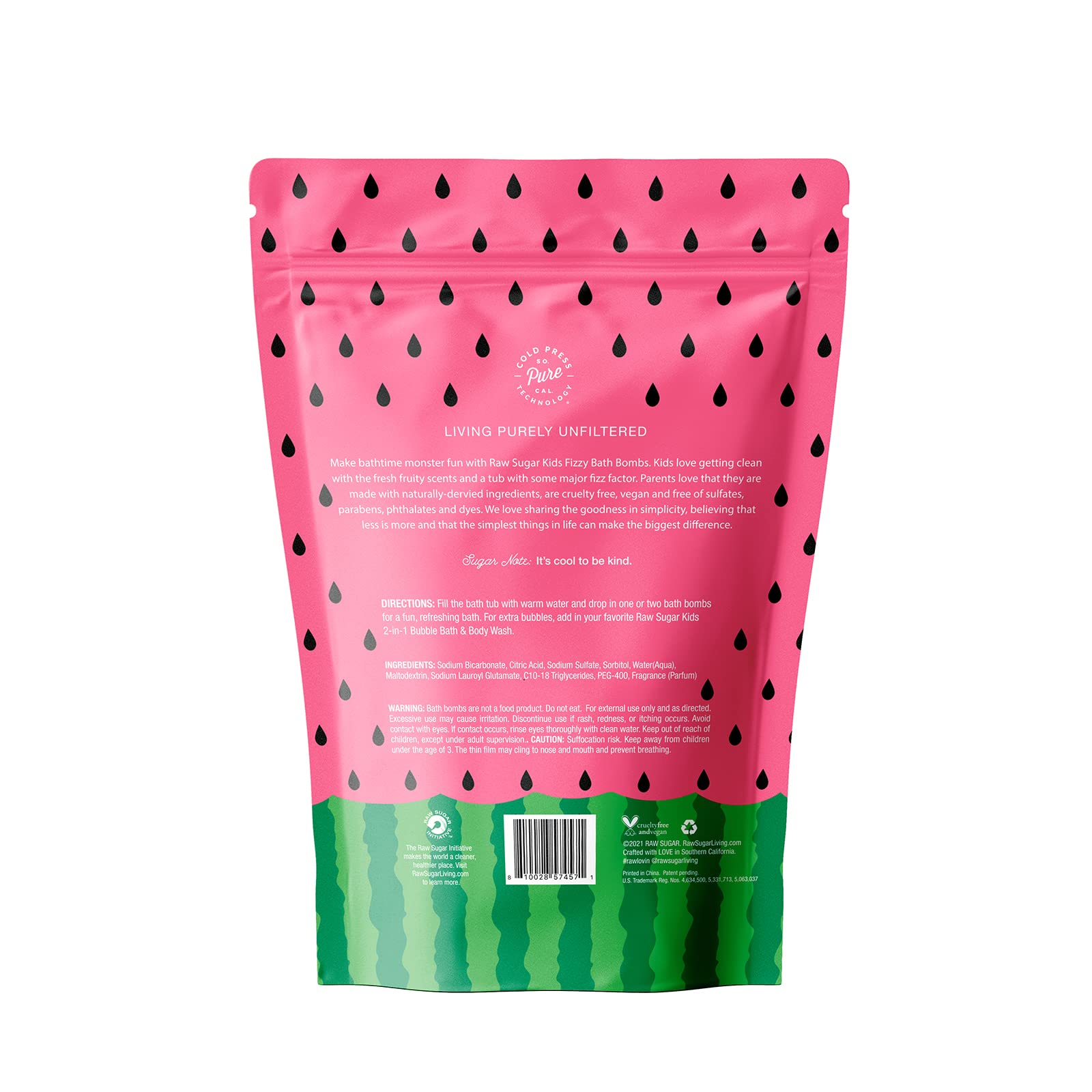 Detalles: Las bombas de burbujas con aroma a sandía y limón incorporan diversión a la rutina de baño de los niños de 3+ años. Son libres de sulfatos SLS y SLES, parabenos y crueldad animal. Además fueron probadas contra alergias para asegurar su uso seguro en la piel de los más pequeños del hogar. En Raw Sugar queremos crear un mundo lleno de amor y respeto hacia las demás personas y el planeta. Por eso creamos productos limpios que ayudan a todas las personas a sentirse más bellas, amadas y poderosas. Queremos que vivas cada día con propósito y pasión mientras Raw Sugar te acompaña con sus deliciosos aromas e ingredientes naturales.