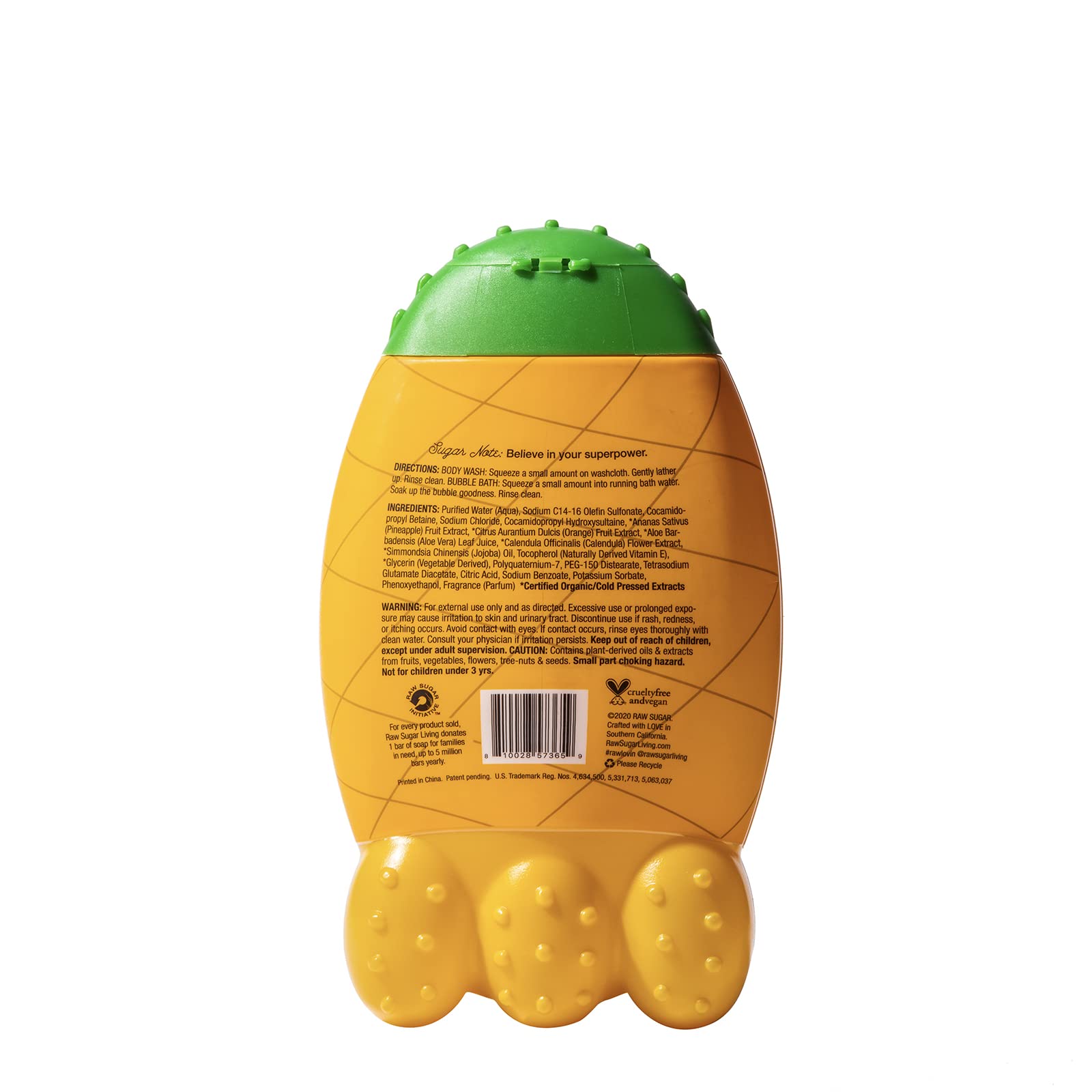 Detalles: Burbujas + Jabón Líquido con aroma a piña y naranja incorpora diversión a la rutina de baño de los niños de 3+ años. Fue elaborado con la tecnología de prensado en frío que extrae la mayor cantidad de nutrientes puros de cada ingrediente. Es libre de sulfatos, parabenos y crueldad animal. Además fue probado contra alergias para asegurar su uso seguro en la piel de los más pequeños del hogar. En Raw Sugar queremos crear un mundo lleno de amor y respeto hacia las demás personas y el planeta. Por eso creamos productos limpios que ayudan a todas las personas a sentirse más bellas, amadas y poderosas. Queremos que vivas cada día con propósito y pasión mientras Raw Sugar te acompaña con sus deliciosos aromas e ingredientes naturales.