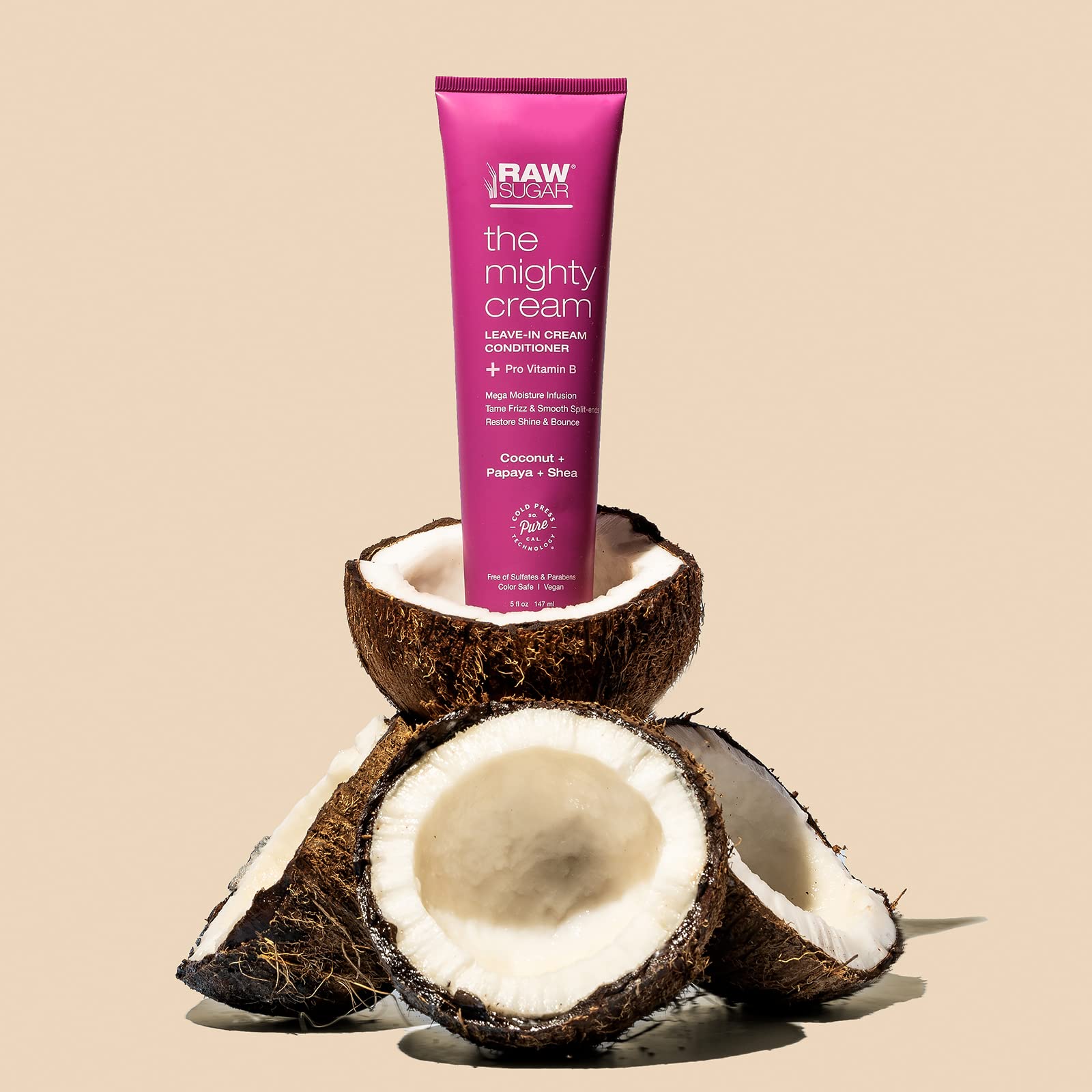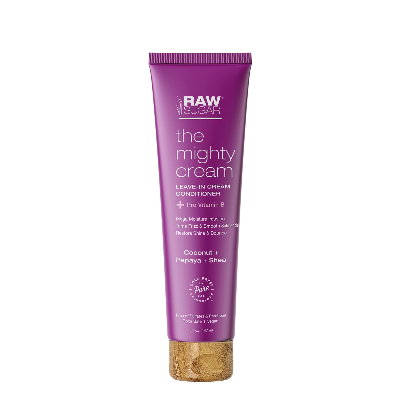 ▶ RAW SUGAR Mighty Cream, Crema Acondicionadora Sin Enjuague, Anti-Frizz, Alisa las Puntas, con Provitamina B, Coco, Papaya y Karité, Prensado en Frío, Vegana, Libre de Sulfatos y Parabenos, 147 ml