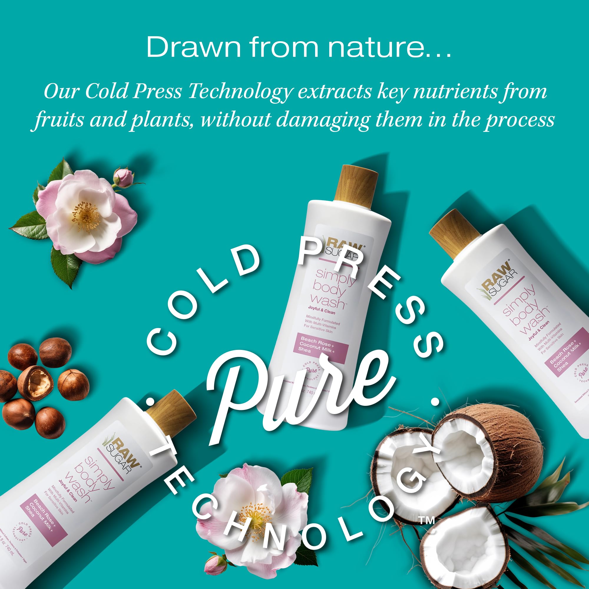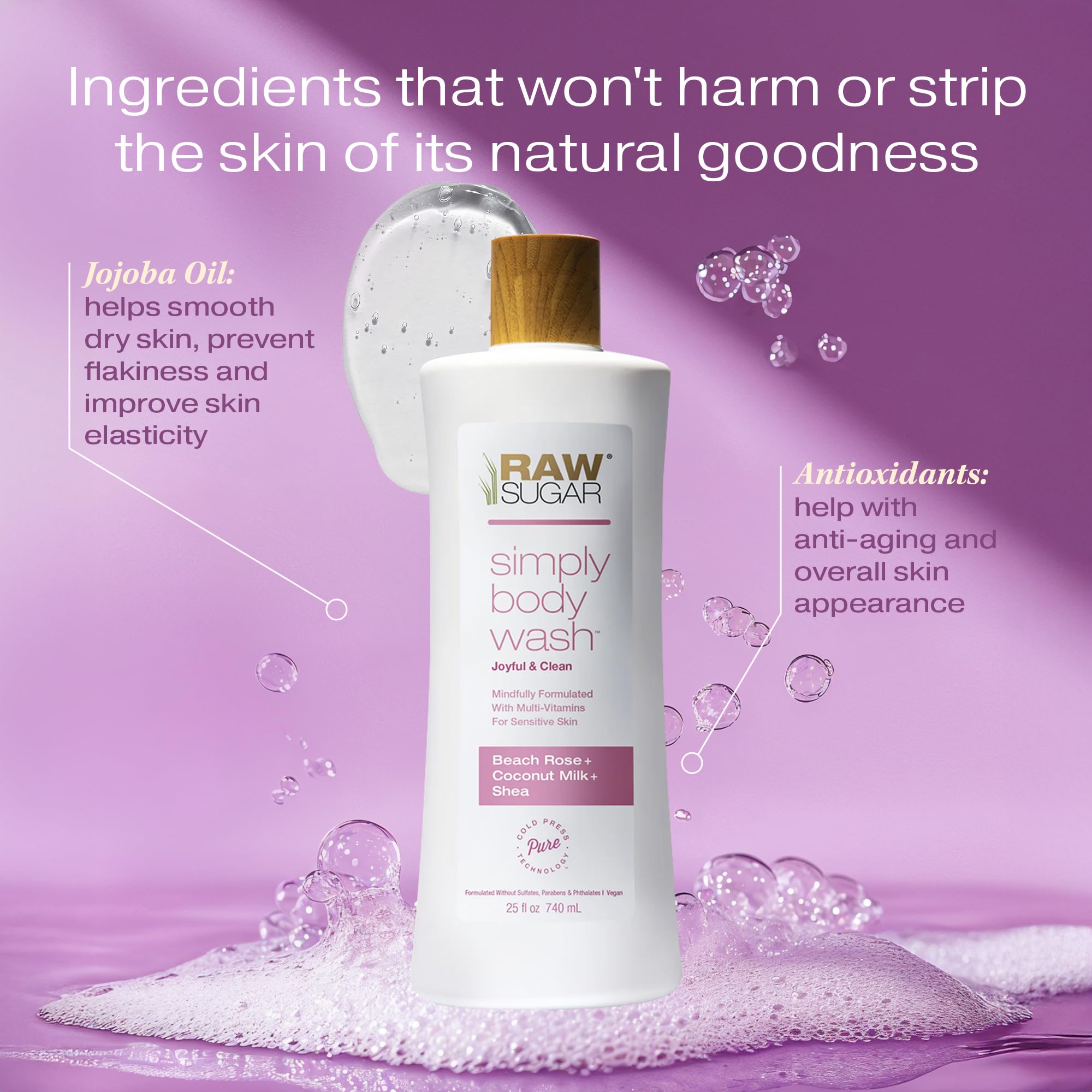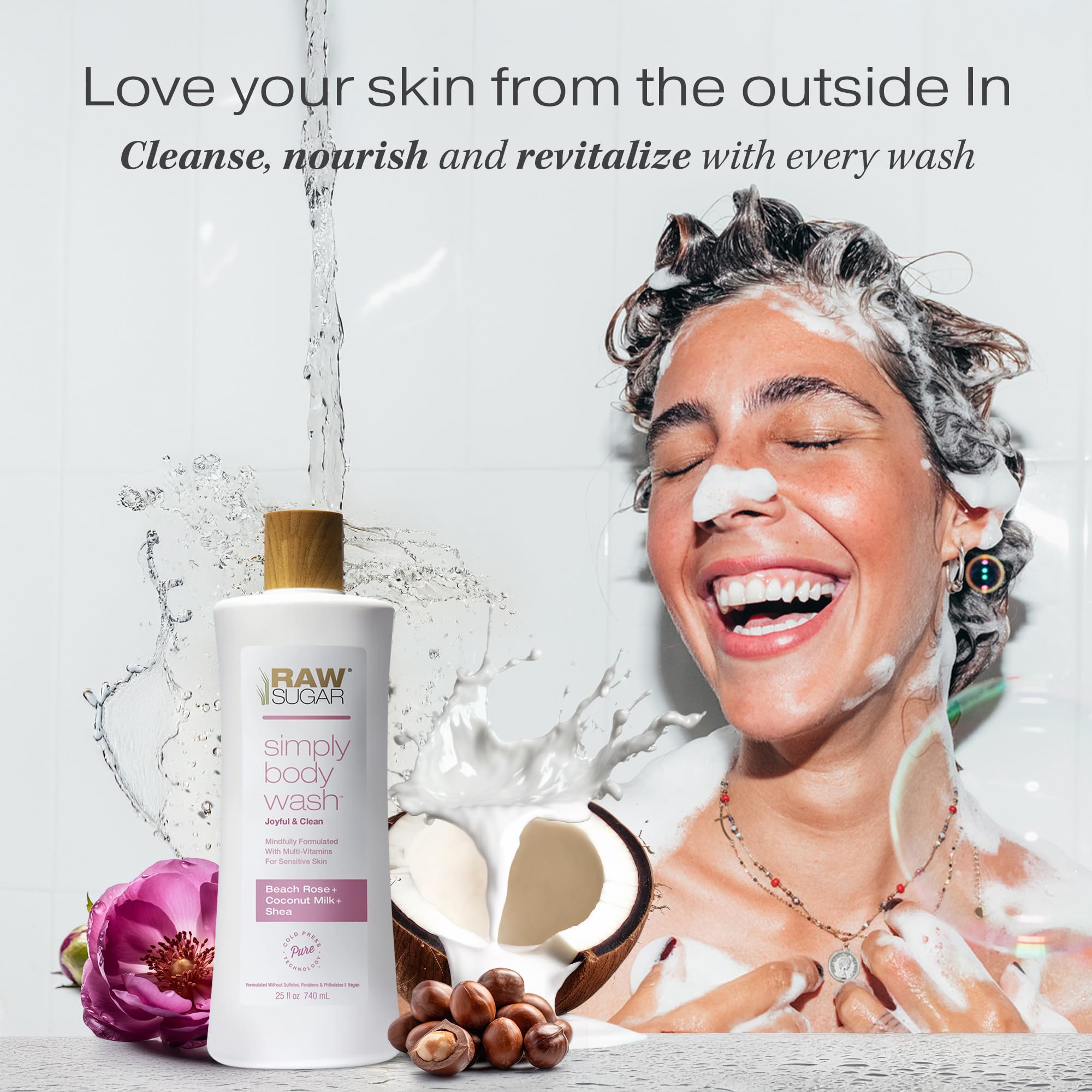 ▶ RAW SUGAR- Simply Body Wash, Beach Rose + Coconut Milk + Shea (25 fl oz, paquete de 3) Jabón de baño para pieles sensibles, F