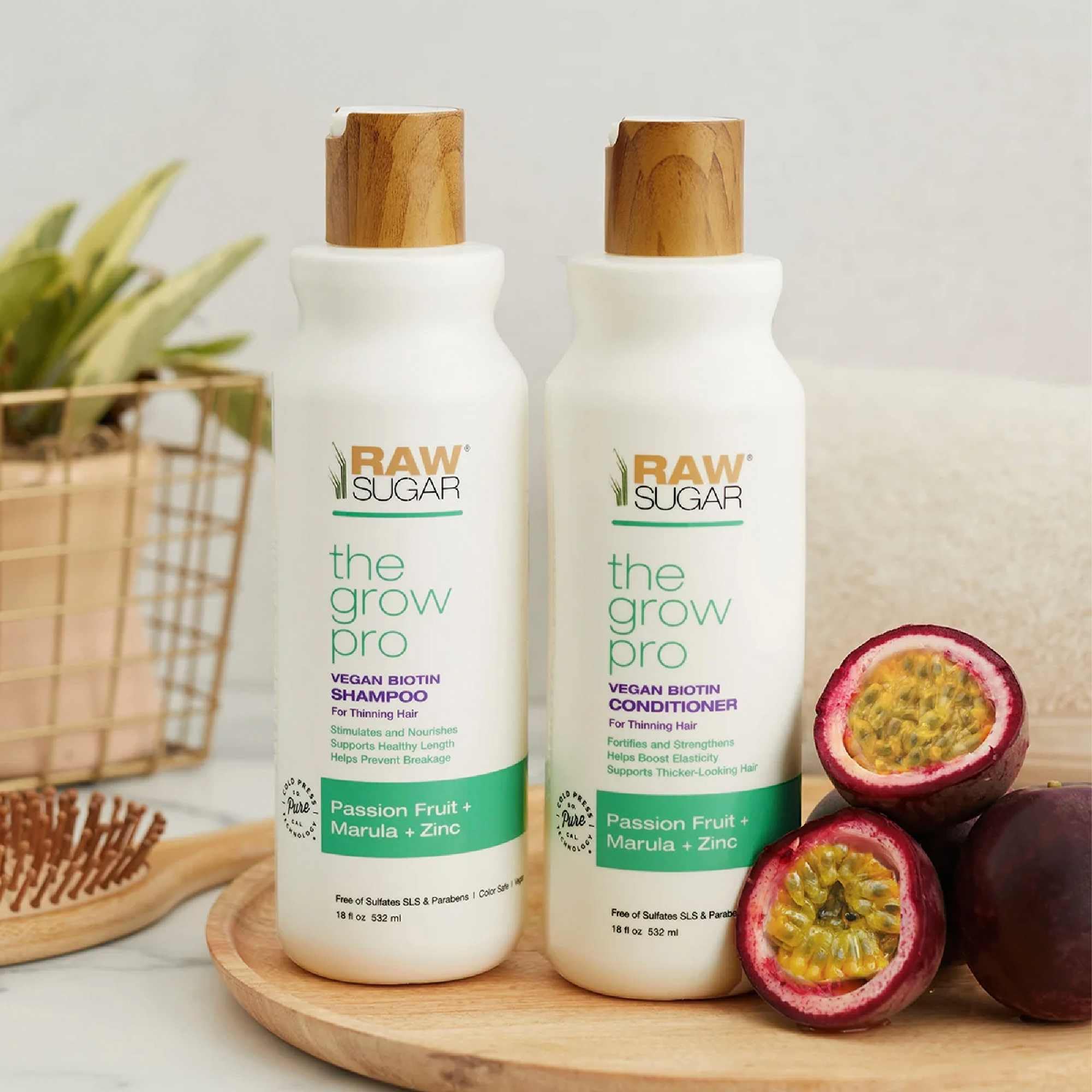 ▶ RAW SUGAR The Grow Pro Acondicionador, Biotina Vegana, Maracuyá y Zinc, Hidrata, Fortalece y Suaviza el Cabello, 18 OZ