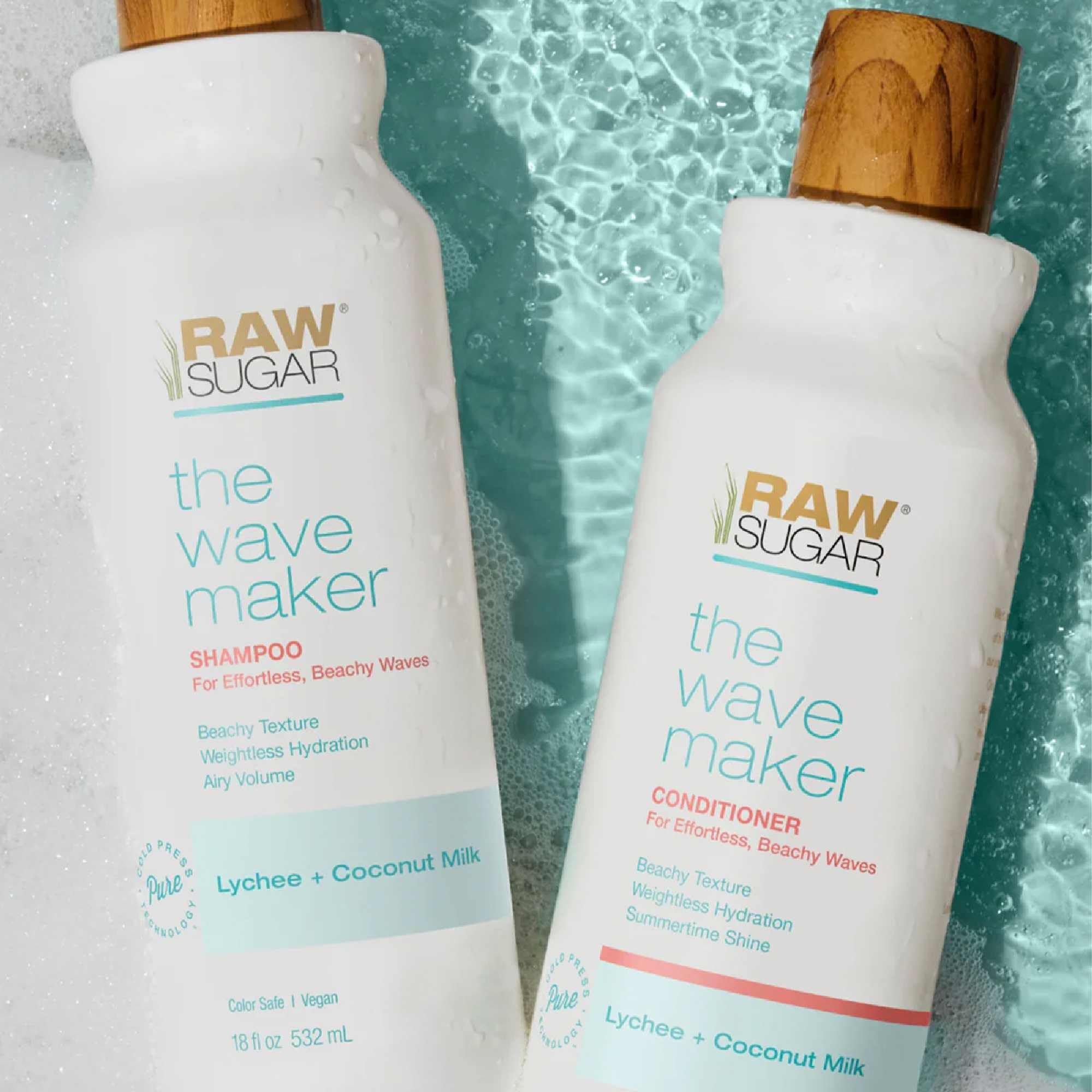 ▶ RAW SUGAR The Wave Maker Acondicionador, con Lichi y Leche de Coco, Nutre, Da Brillo y Volumen, sin Sulfatos, 18 OZ
