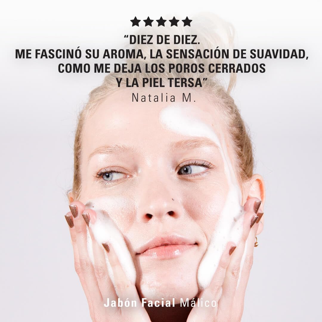 Detalles: BENEFICIOS: Este jabón facial en espuma limpia en profundidad, exfolia e hidrata tu piel, dejándola naturalmente sana, radiante, suave y con glow natural. Está diseñada con baja espuma para remover impurezas, emparejar el tono, quitar la opacidad de tu piel y disminuir la apariencia de lineas de expresión. USO: De día y de noche, este jabón es el paso n*1 de tu rutina facial de skincare. Aplica la espuma sobre tu mano y luego en cara, cuello y escote. Haz m a s aje s circulares ascendentes. Deja actuar 1-2 minutos y retira con agua. Luego aplica tónico, serum gel, serum macadmia , rosa mosqueta, h+argán , divina, crema contorno de ojos y protege tu piel con bb cream o filtro solar +50fps . INGREDIENTES: Agua (aqua), aloe vera (extracto pulpa aloe bardensis), hidrolato de caléndula (flor caléndula officinalis), decylglucoside (cáscara de coco), extracto de toronja (semilla citrus x paradisi), glicerina vegetal (glycerin), ácido cítrico (citric acid), aceite esencial de incienso (resina boswellia carterii) y toronja (cáscara citrus x paradisi) y ácido málico de manzana 3.5% (malic acid). 100% Oil Free, pH 4 y libre de sulfatos.