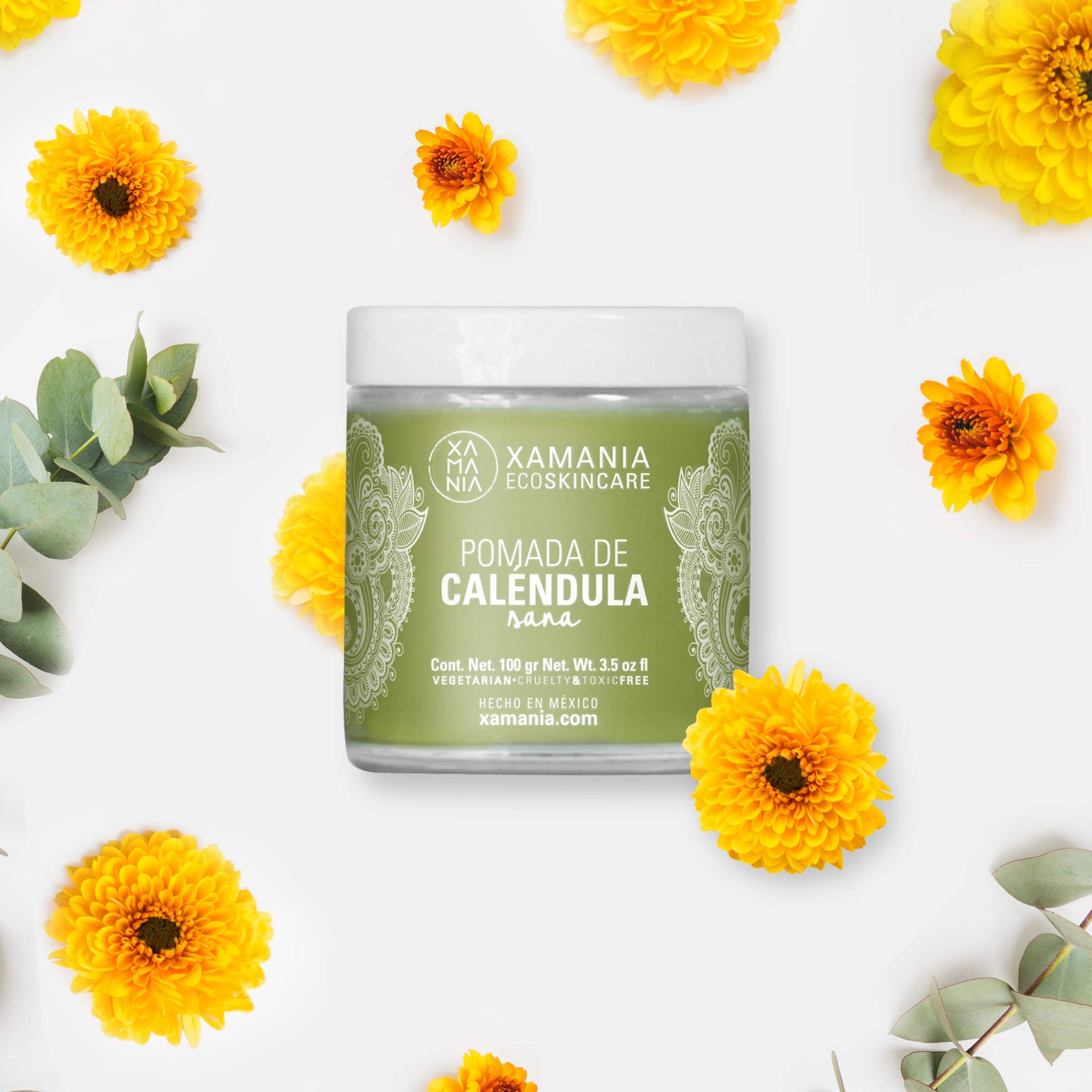 XAMANIA Pomada de Caléndula Orgánica. Ungüento Vegano Multiusos Sanador para el Tratamiento de Piel Seca, Sensible, Eczema, Rosacea. 106 gr.
