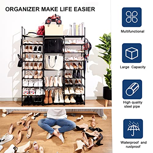 - 【ZAPATERO DE 9 NIVELES DE GRAN CAPACIDAD】: El organizador de zapatero puede contener de 50 a 55 pares de zapatos, manteniendo su espacio limitado organizado. Los zapateros de diferentes alturas están diseñados para adaptarse a botas, tacones, cajas de zapatos u otros accesorios más grandes. Los organizadores de zapatos y el almacenamiento para el armario vienen con 10 ganchos multifuncionales, puedes colgar muchas cosas en él. Y con 3 láminas de PP, es resistente al agua y fácil de limpiar. Qué diseño tan conveniente.